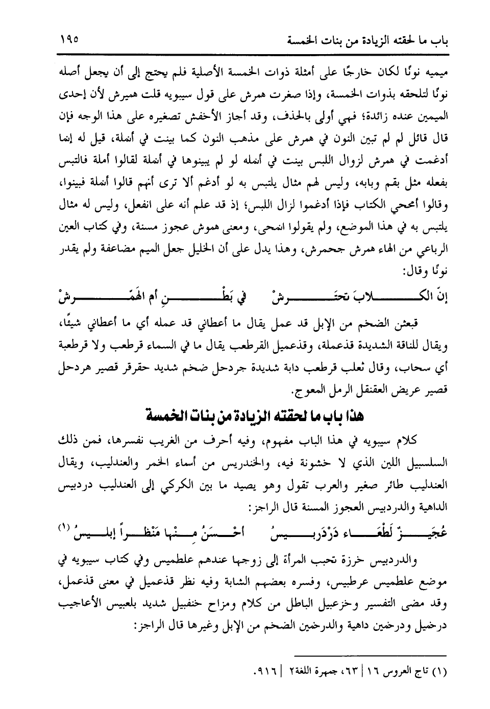 كلام سيبويه في هذا الباب مفهوم، وفيه أحرف من الغريب نفسرها، فمن ذلك السلسبيل اللين الذي لا خشونة فيه، والخندريس من أسماء الخمر والعندليب، ويقال العندليب طائر صغير والعرب تقول وهو يصيد ما بين الكركي إلى العندليب دردبيس الداهية والدردبيس العجوز المسنة قال الراجز: