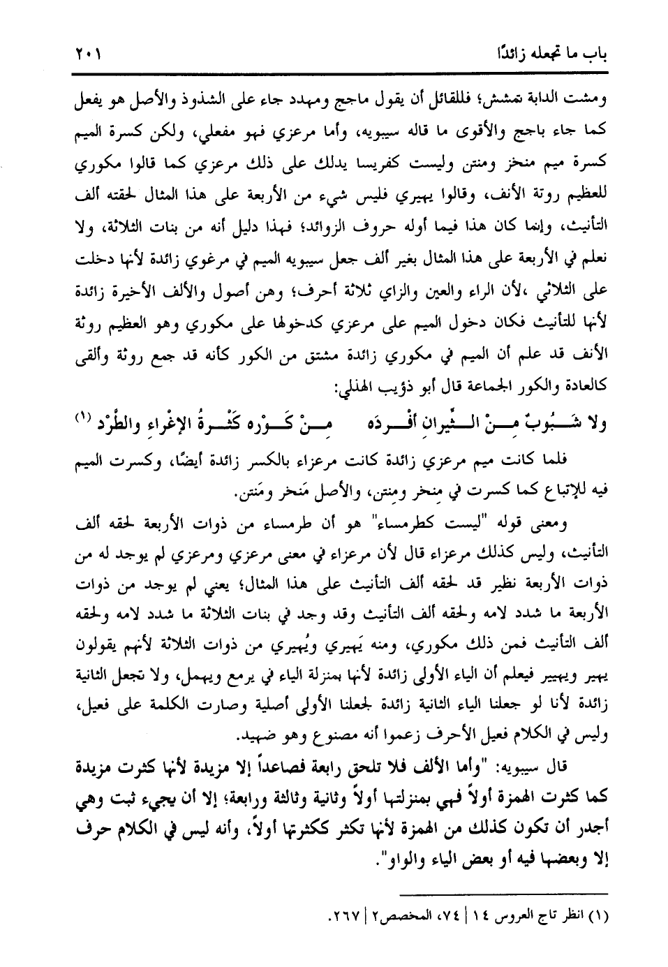 ومشت الدابة تمشش؛ فللقائل أن يقول ماجج ومهدد جاء على الشذوذ والأصل هو يفعل كما جاء باجج والأقوى ما قاله سيبويه، وأما مرعزي فهو مفعلي، ولكن كسرة الميم كسرة ميم منخز ومنتن وليست كفريسا يدلك على ذلك مرعزي كما قالوا مكوري للعظيم روتة الأنف، وقالوا يهيري فليس شيء من الأربعة على هذا المثال لحقته ألف التأنيث، وإنما كان هذا فيما أوله حروف الزوائد؛ فهذا دليل أنه من بنات الثلاثة، ولا نعلم في الأربعة على هذا المثال بغير ألف جعل سيبويه الميم في مرغوي زائدة لأنها دخلت على الثلاثي، لأن الراء والعين والزاي ثلاثة أحرف؛ وهن أصول والألف الأخيرة زائدة لأنها للتأنيث فكان دخول الميم على مرعزي كدخولها على مكوري وهو العظيم روثة الأنف قد علم أن الميم في مكوري زائدة مشتق من الكور كأنه قد جمع روثة وألقى كالعادة والكور الجماعة قال أبو ذؤيب الهذلي: