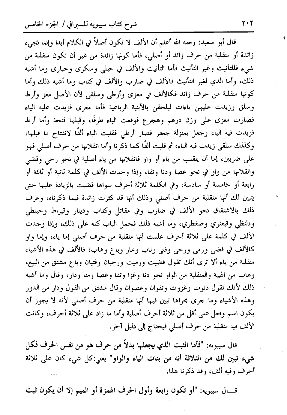 قال أبو سعيد: رحمه الله أعلم أن الألف لا تكون أصلا في الكلام أبدا وإنما تجيء زائدة أو منقلبة من حرف زائد أو