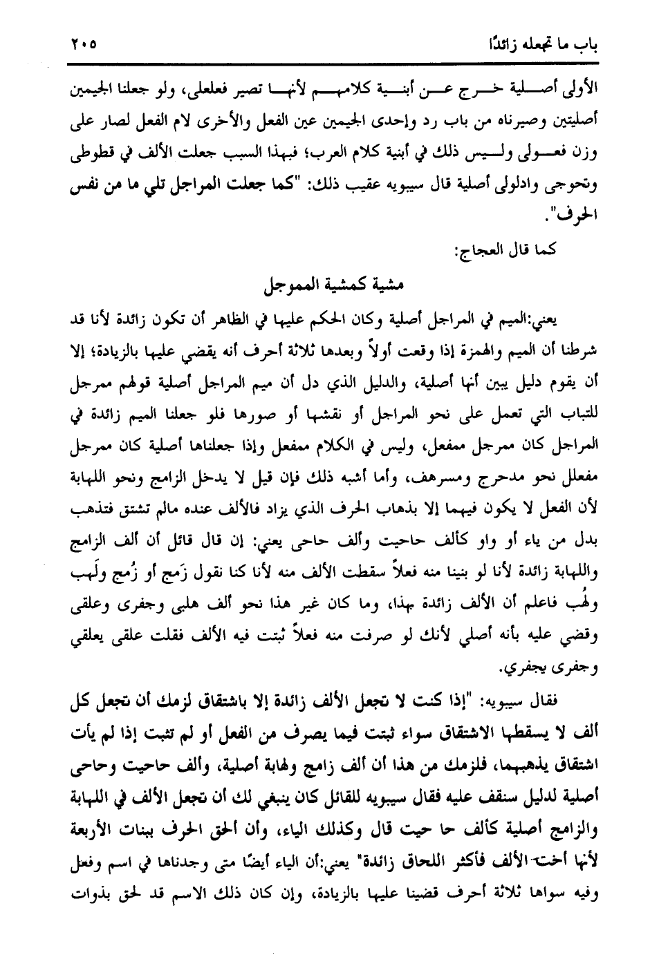 يزاد فالألف عنده ما لم تشتق فتذهب بدل من ياء أو واو كألف حاحيت وألف حاحى يعني: إن قال قائل أن ألف الزامج واللهابة زائدة لأنا لو بنينا منه فعلا سقطت الألف منه لأنا كنا نقول زمج أو زمج ولهب ولهب فاعلم أن الألف زائدة بهذا، وما كان غير هذا نحو ألف هلبى وجفرى وعلقى وقضي عليه بأنه أصلي لأنك لو صرفت منه فعلا ثبتت فيه الألف فقلت علقى يعلقي وجفرى يجفري.