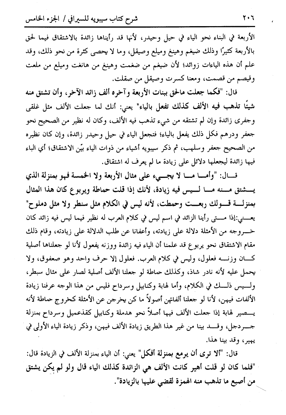 قال: " وأما ما لا يجيء على مثال الأربعة ولا الخمسة فهو بمنزلة الذي يشتق منه ما ليس فيه زيادة، لأنك إذا قلت حماطة ويربوع كان هذا المثال بمنزلة قولك ربعت وحمطت، لأنه ليس في الكلام مثل سنطر ولا مثل دملوح " يعني: إذا متى رأينا الزائد في اسم ليس في كلام العرب له نظير فيما ليس فيه زائد كان خروجه من الأمثلة دلالة على زيادته، وأعفانا عن طلب الدلالة على زيادته، وقام ذلك مقام الاشتقاق نحو يربوع قد علمنا أن الياء فيه زائدة ووزنه يفعول لأنا لو جعلناها أصلية كان وزنه فعلول، وليس في كلام العرب. فعلول إلا حرف واحد وهو صعفوق، ولا يحمل عليه لأنه نادر شاذ، وكذلك حماطة لو جعلنا الألف أصلية لصار على مثال سبطر، وليس ذلك في
