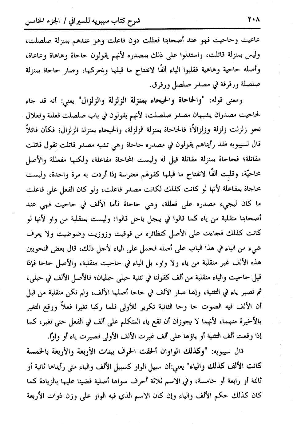 ومعنى قوله: " والحاحاة والحيحاء بمنزلة الزلزلة والزلزال " يعني: أنه قد جاء لحاحيت مصدران يشبهان مصدر صلصلت، لأنهم يقولون في باب صلصلت فعللة وفعلال نحو زلزلت زلزلة وزلزالا؛ فالحاحاة بمنزلة الزلزلة، والحيحاء بمنزلة الزلزال؛ فكأن قائلا قال لسيبويه فقد رأيناهم يقولون في مصدره حاحاة وهي تشبه مصدر قاتلت تقول قاتلت مقاتلة؛ فحاحاة بمنزلة مقاتلة قيل له وليست المحاحاة مفاعلة، ولكنها مفعللة والأصل محاحيّة، وقلبت ألفا لانفتاح ما قبلها كقولهم معترسة إذا أردت به مرة واحدة، وليست محاجاة بمفاعلة لأنها لو كانت كذلك لكانت مصدر فاعلت، ولو كان الفعل على فاعلت ما كان ليجيء مصدره على فعللة، وهي حاحاة فأما الألف في حاحيت فهي عند أصحابنا منقلبة من ياء كما قالوا في ييجل ياجل قالوا: وليست بمنقلبة من واو لأنها لو كانت كذلك فجاءت على الأصل كنظائره من قوقيت وزوزيت وضوضيت ولا يعرف شيء من الياء في هذا الباب على أصله فحمل على الياء لأجل ذلك، قال بعض النحويين هذه الألف غير منقلبة من ياء ولا واو، بل الياء في حاحيت منقلبة، والأصل حاحا فإذا قيل حاحيت والياء منقلبة من ألف كقولنا في تثنية حبلى حبليان؛ فالأصل الألف في حبلى، ثم تصبر ياء في التثنية، وإنما صار الألف في حاحا أصلها الألف، ولم تكن منقلبة من قبل أن الألف فيه الصوت حا وحا الثانية تكرير للأولى فلما ركبا تغيرا فعلا ووقع التغير بالأخيرة منهما، لأنهما لا يجوزان أن تقع ياء المتكلم على ألف في الفعل حتى تغير، كما إذا وقعت ألف التثنية أو ياؤها على ألف غيرت الألف الأولى فصيرت ياء أو واوا.