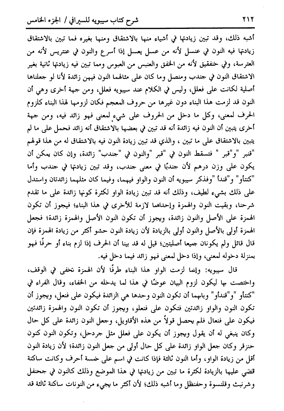 أشبه ذلك، وقد تبين زيادتها في أشياء منها بالاشتقاق ومنها بغيره فما تبين بالاشتقاق زيادتها فيه النون في عنسل لأنه من عسل يعسل إذا أسرع والنون في عنتريس لأنه من العترسة، وفي خنفقيق لأنه من الخفق والعنبس من العبوس ومما تبين فيه زيادتها ثانية بغير الاشتقاق النون في جندب ومنصل وما كان على مثالهما النون فيهن زائدة لأنا لو جعلناها أصلية لكانت على فعلل، وليس في الكلام عند سيبويه فعلل، ومن جهة أخرى وهي أن النون قد لزمت هذا البناء دون غيرها من حروف المعجم فكان لزومها لهذا البناء كلزوم الحرف لمعنى، وكل ما دخل من الحروف على شيء لمعنى فهو زائد فيه، ومن جهة أخرى يتبين أن النون فيه زائدة أنه قد تبين في بعضها بالاشتقاق أنه زائد فحمل على ما لم يتبين بالاشتقاق على ما تبين، والذي قد تبين زيادة النون فيه بالاشتقاق له من هذا قولهم " قنبر " و " قبر " فتسقط النون في " قبر " والنون في " جندب " زائدة، وإن كان يمكن أن يكون على وزن