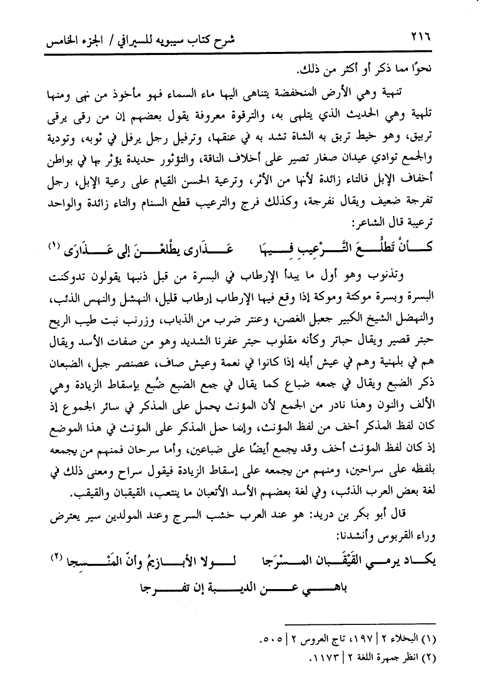 وتذنوب وهو أول ما يبدأ الإرطاب في البسرة من قبل ذنبها يقولون تدوكنت البسرة وبسرة موكتة وموكة إذا وقع فيها الإرطاب إرطاب قليل، النهشل والنهس الذئب، والنهضل الشيخ الكبير جعبل الغصن، وعنتر ضرب من الذباب، وزرنب نبت طيب الريح حبتر قصير ويقال حباتر وكأنه مقلوب حبتر عفرنا الشديد وهو من صفات الأسد ويقال هم في بلهنية وهم في عيش أبله إذا كانوا في نعمة وعيش صاف، عصنصر جبل، الضبعان ذكر الضبع ويقال في جمعه ضباع كما يقال في جمع الضبع ضبع بإسقاط الزيادة وهي الألف والنون وهذا نادر من الجمع لأن المؤنث يحمل على المذكر في سائر الجموع إذ كان لفظ المذكر أخف من لفظ المؤنث، وإنما حمل المذكر على المؤنث في هذا الموضع إذ كان لفظ المؤنث أخف وقد يجمع أيضا على ضباعين، وأما سرحان فمنهم من يجمعه بلفظه على سراحين، ومنهم من يجمعه على إسقاط الزيادة فيقول سراح ومعنى ذلك في لغة بعض العرب