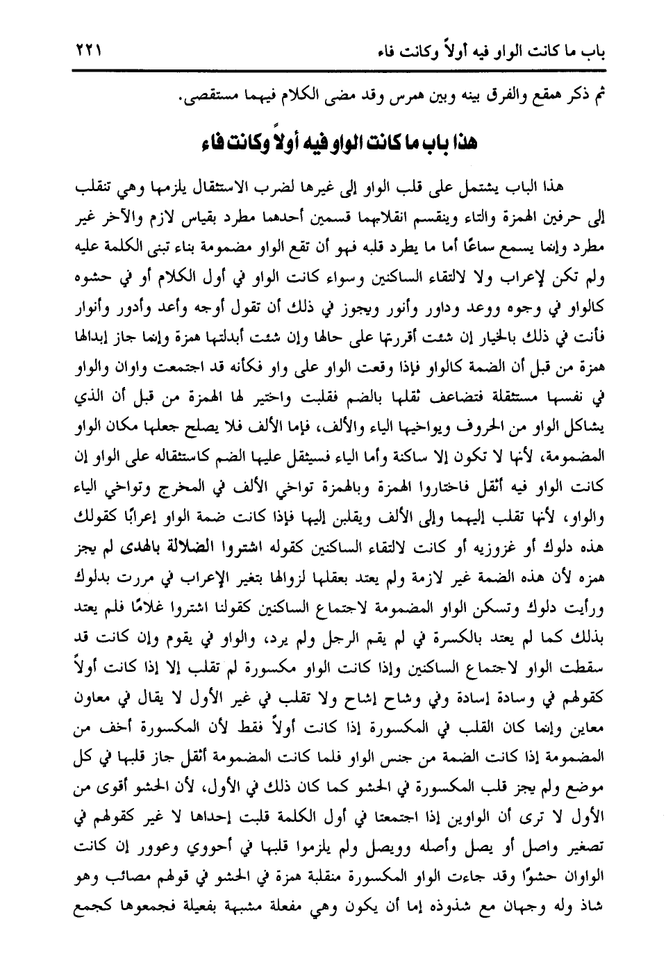 هذا الباب يشتمل على قلب الواو إلى غيرها لضرب الاستثقال يلزمها وهي تنقلب إلى حرفين الهمزة والتاء وينقسم انقلابهما قسمين أحدهما مطرد بقياس لازم والآخر غير مطرد وإنما يسمع سماعا أما ما يطرد قلبه فهو أن تقع الواو مضمومة بناء تبنى الكلمة عليه ولم تكن لإعراب ولا لالتقاء الساكنين وسواء كانت الواو في أول الكلام أو في حشوه كالواو في وجوه ووعد وداور وأنور ويجوز في ذلك أن تقول أوجه وأعد وأدور وأنوار فأنت في ذلك بالخيار إن شئت أقررتها على حالها وإن شئت أبدلتها همزة وإنما جاز إبدالها همزة من قبل أن الضمة كالواو فإذا وقعت الواو على واو فكأنه قد اجتمعت واوان والواو في نفسها مستثقلة فتضاعف ثقلها بالضم فقلبت واختير لها الهمزة من قبل أن الذي يشاكل الواو من الحروف ويواخيها الياء والألف، فإما الألف فلا يصلح جعلها مكان الواو المضمومة، لأنها لا تكون إلا ساكنة وأما الياء فسيثقل عليها الضم كاستثقاله على الواو إن كانت الواو فيه أثقل فاختاروا الهمزة وبالهمزة تواخي الألف في المخرج وتواخي الياء والواو، لأنها تقلب إليهما وإلى الألف ويقلبن إليها فإذا كانت ضمة الواو إعرابا كقولك هذه دلوك أو غزوزيه أو كانت لالتقاء الساكنين كقوله اشتروا الضلالة بالهدى لم يجز همزة لأن هذه الضمة غير لازمة ولم يعتد بعقلها لزوالها بتغير الإعراب في مررت بدلوك ورأيت دلوك وتسكن الواو المضمومة لاجتماع الساكنين كقولنا اشتروا غلاما فلم يعتد بذلك كما لم يعتد بالكسرة في لم يقم الرجل ولم يرد، والواو في يقوم وإن كانت قد سقطت الواو لاجتماع الساكنين وإذا كانت الواو مكسورة لم تقلب إلا إذا كانت أولا كقولهم في وسادة إسادة وفي وشاح إشاح ولا تقلب في غير الأول لا يقال في معاون معاين وإنما كان القلب في المكسورة إذا كانت أولا فقط لأن المكسورة أخف من المضمومة إذا كانت الضمة من جنس الواو فلما كانت المضمومة أثقل جاز قلبها في كل موضع ولم يجز قلب المكسورة في الحشو كما كان ذلك في الأول، لأن الحشو أقوى من الأول لا ترى أن الواوين إذا اجتمعتا في أول الكلمة قلبت إحداها لا غير كقولهم في تصغير واصل أو يصل وأصله وويصل ولم يلزموا قلبها في أحووي وعوور إن كانت الواوان حشوا وقد جاءت الواو المكسورة منقلبة همزة في الحشو في قولهم مصائب وهو شاذ وله وجهان مع شذوذه إما أن يكون وهي مفعلة مشبهة بفعيلة فجمعوها كجمع