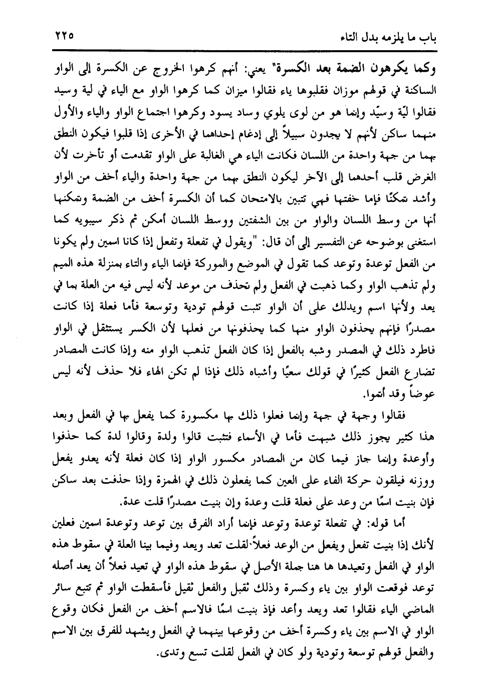 قلب أحدهما إلى الآخر ليكون النطق بهما من جهة واحدة والياء أخف من الواو وأشد تمكنا فإما خفتها فهي تتبين بالامتحان كما أن الكسرة أخف من الضمة وتمكنها أنها من وسط اللسان والواو من بين الشفتين ووسط اللسان أمكن ثم ذكر سيبويه كما استغنى بوضوحه عن التفسير إلى أن قال: " ويقول في تفعلة وتفعل إذا كانا اسمين ولم يكونا من الفعل توعدة وتوعد كما تقول في الموضع والموركة فإنما الياء والتاء بمنزلة هذه الميم ولم تذهب الواو وكما ذهبت في الفعل ولم تحذف من موعد لأنه ليس فيه من العلة بما في يعد ولأنها اسم ويدلك على أن الواو تثبت قولهم تودية وتوسعة فأما فعلة إذا كانت مصدرا فإنهم يحذفون الواو منها كما يحذفونها من فعلها لأن الكسر يستثقل في الواو فاطرد ذلك في المصدر وشبه بالفعل إذا كان الفعل تذهب الواو منه وإذا كانت المصادر تضارع الفعل كثيرا في قولك سعيا وأشباه ذلك فإذا لم تكن الهاء فلا حذف لأنه ليس عوضا وقد أتموا.