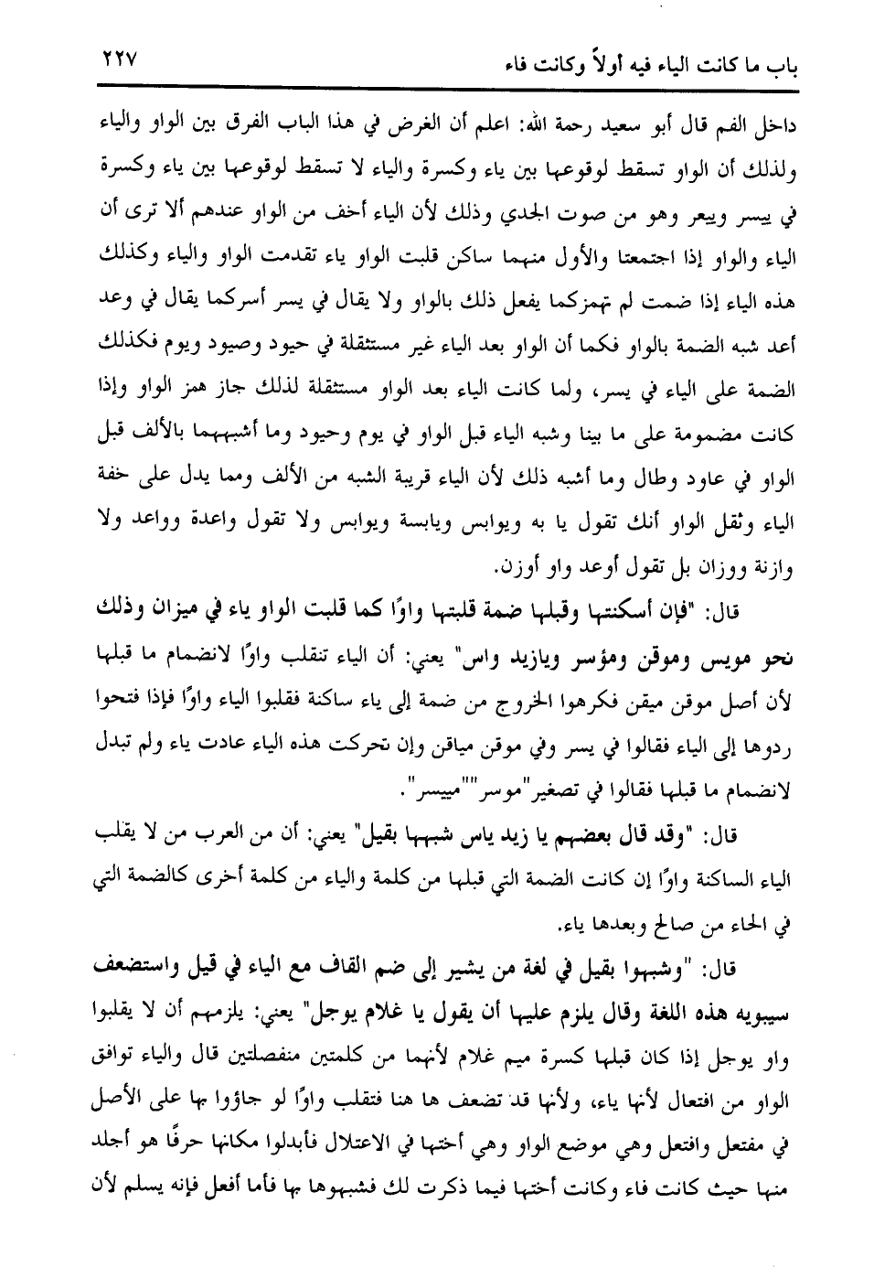 داخل الفم قال أبو سعيد رحمة الله: اعلم أن الغرض في هذا الباب الفرق بين الواو والياء ولذلك أن الواو تسقط لوقوعها بين ياء وكسرة والياء لا تسقط لوقوعها بين ياء وكسرة في ييسر وييعر وهو من صوت الجدي وذلك لأن الياء أخف من الواو عندهم ألا ترى أن الياء والواو إذا اجتمعتا والأول منهما ساكن قلبت الواو ياء تقدمت الواو والياء وكذلك هذه الياء إذا ضمت لم تهمزكما يفعل ذلك بالواو ولا يقال في يسر أسركما يقال في وعد أعد شبه الضمة بالواو فكما أن الواو بعد الياء غير مستثقلة في حيود وصيود ويوم فكذلك الضمة على الياء في يسر، ولما كانت الياء بعد الواو مستثقلة لذلك جاز همز الواو وإذا كانت مضمومة على ما بينا وشبه الياء قبل الواو في يوم وحيود وما أشبههما بالألف قبل الواو في عاود وطال وما أشبه ذلك لأن الياء قريبة الشبه من الألف ومما يدل على