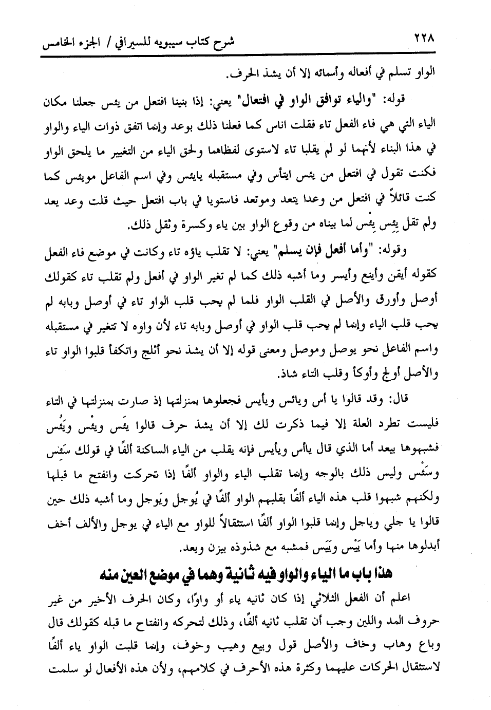 اعلم أن الفعل الثلاثي إذا كان ثانيه ياء أو واوا، وكان الحرف الأخير من غير حروف المد واللين وجب أن تقلب ثانية ألفا، وذلك لتحركه وانفتاح ما قبله كقولك قال وباع وهاب وخاف والأصل قول وبيع وهيب وخوف، وإنما قلبت الواو ياء ألفا لاستثقال الحركات عليهما وكثرة هذه الأحرف في كلامهم، ولأن هذه الأفعال لو سلمت