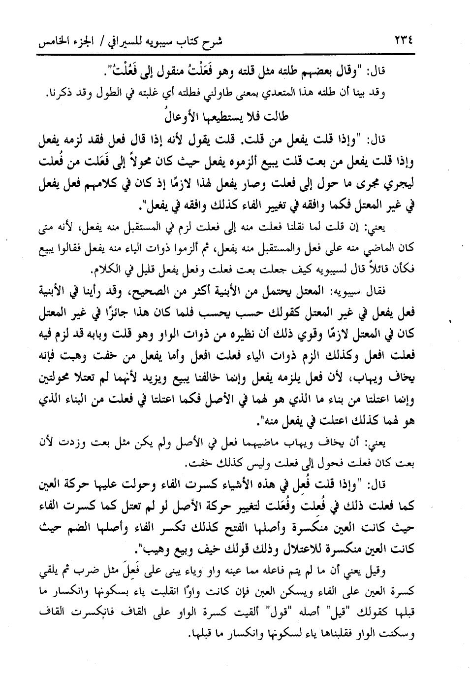 فقال سيبويه: المعتل يحتمل من الأبنية أكثر من الصحيح، وقد رأينا في الأبنية فعل يفعل في غير المعتل كقولك حسب يحسب فلما كان هذا جائزا في غير المعتل كان في المعتل لازما وقوي ذلك أن نظيره من ذوات الواو وهو قلت وبابه قد لزم فيه فعلت افعل وكذلك الزم ذوات الياء فعلت افعل وأما يفعل من خفت وهبت فإنه يخاف ويهاب، لأن فعل يلزمه يفعل وإنما خالفنا يبيع ويزيد لأنهما لم تعتلا محولتين وإنما اعتلتا من بناء ما الذي هو لهما في الأصل فكما اعتلتا في فعلت من البناء الذي هو لهما كذلك اعتلت في يفعل منه ".