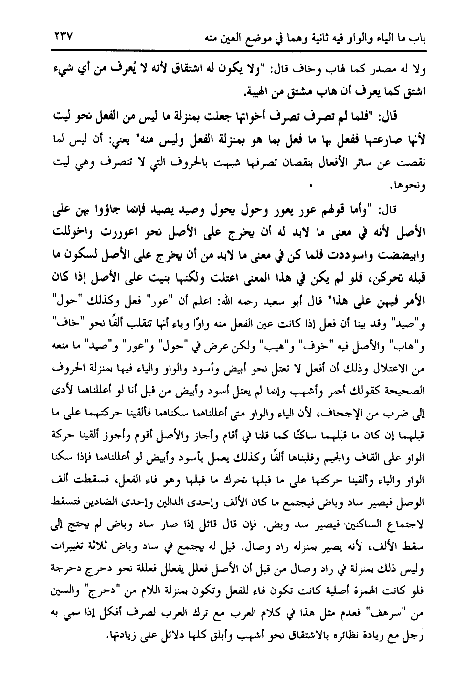 قال: " وأما قولهم عور يعور وحول يحول وصيد يصيد فإنما جاؤوا بهن على الأصل لأنه في معنى ما لا بد له أن يخرج على الأصل نحو اعوررت واخوللت وابيضضت واسوددت فلما كن في معنى ما لا بد من أن يخرج على الأصل لسكون ما قبله تحركن، فلو لم يكن في هذا المعنى اعتلت ولكنها بنيت على الأصل إذا كان الأمر فيهن على هذا " قال أبو سعيد رحمه الله: اعلم أن " عور " فعل وكذلك " حول " و " صيد " وقد بينا أن فعل إذا كانت عين الفعل منه واوا وياء أنها تنقلب ألفا نحو " خاف " و " هاب " والأصل فيه " خوف " و " هيب " ولكن عرض في " حول " و "
