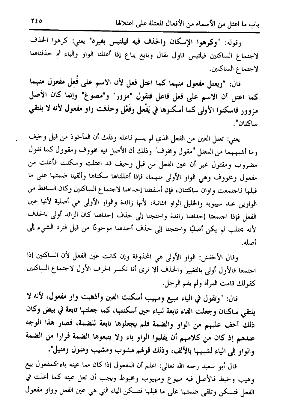 قال أبو سعيد رحمه الله تعالى: اعلم أن المفعول إذا كان مما عينه ياء كمفعول بيع وهيب وخيط فالأصل فيه مبيوع ومهيوب ومخيوط ويجب أن تعل عينه كما أعلت في الفعل فتسكن وتلقى ضمتها على ما قبلها فتسكن الياء التي هي عين الفعل وواو مفعول