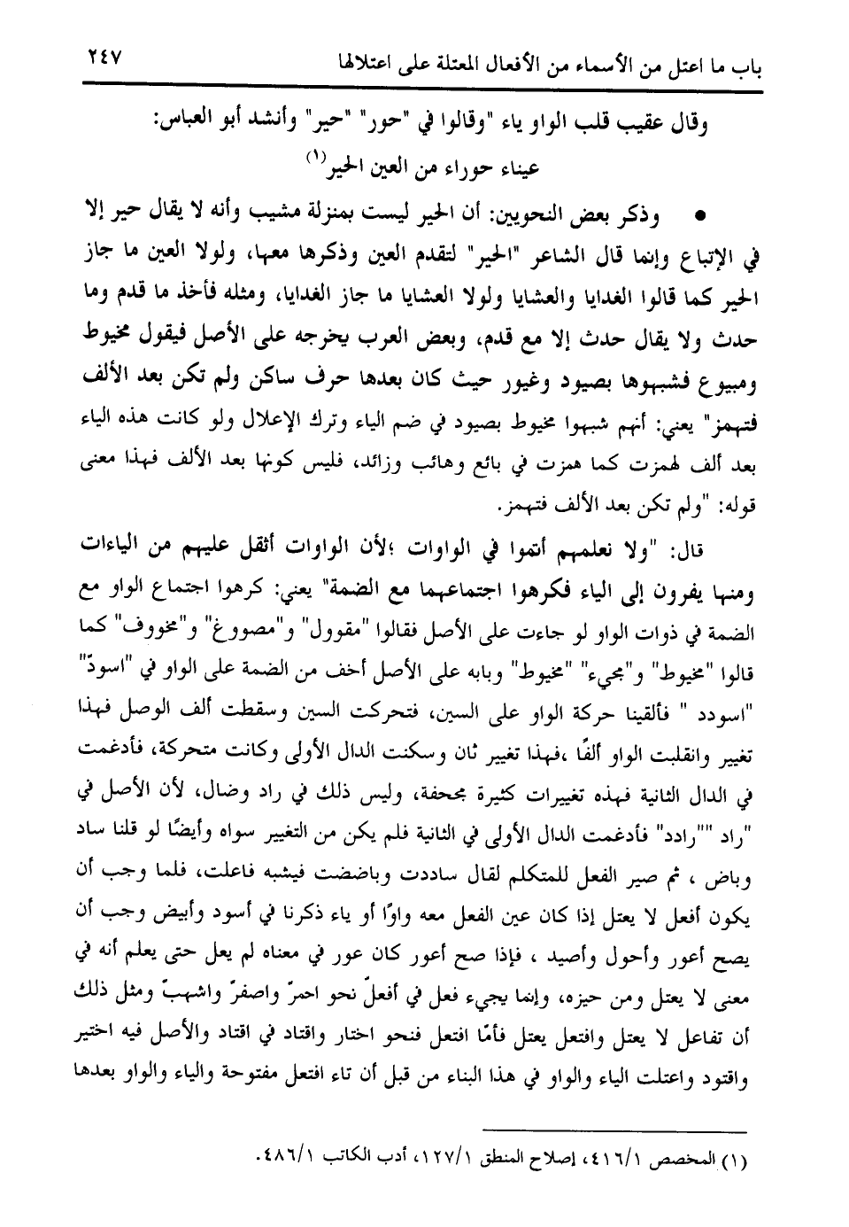 * وذكر بعض النحويين: أن الحير ليست بمنزلة مشيب وأنه لا يقال حير إلا في الإتباع وإنما قال الشاعر " الحير " لتقدم العين وذكرها معها، ولولا العين ما جاز الحير كما قالوا الغدايا والعشايا ولولا العشايا ما جاز الغدايا، ومثله فأخذ ما قدم وما حدث ولا يقال حدث إلا مع قدم، وبعض العرب يخرجه على الأصل فيقول مخيوط ومبيوع فشبهوها بصيود وغيور حيث كان بعدها حرف ساكن ولم تكن بعد الألف فتهمز " يعني: أنهم شبهوا مخيوط بصيود في ضم الياء وترك الإعلال ولو كانت هذه الياء بعد ألف لهمزت كما همزت في بائع وهائب وزائد، فليس كونها بعد الألف فهذا معنى قوله: " ولم تكن بعد الألف فتهمز.