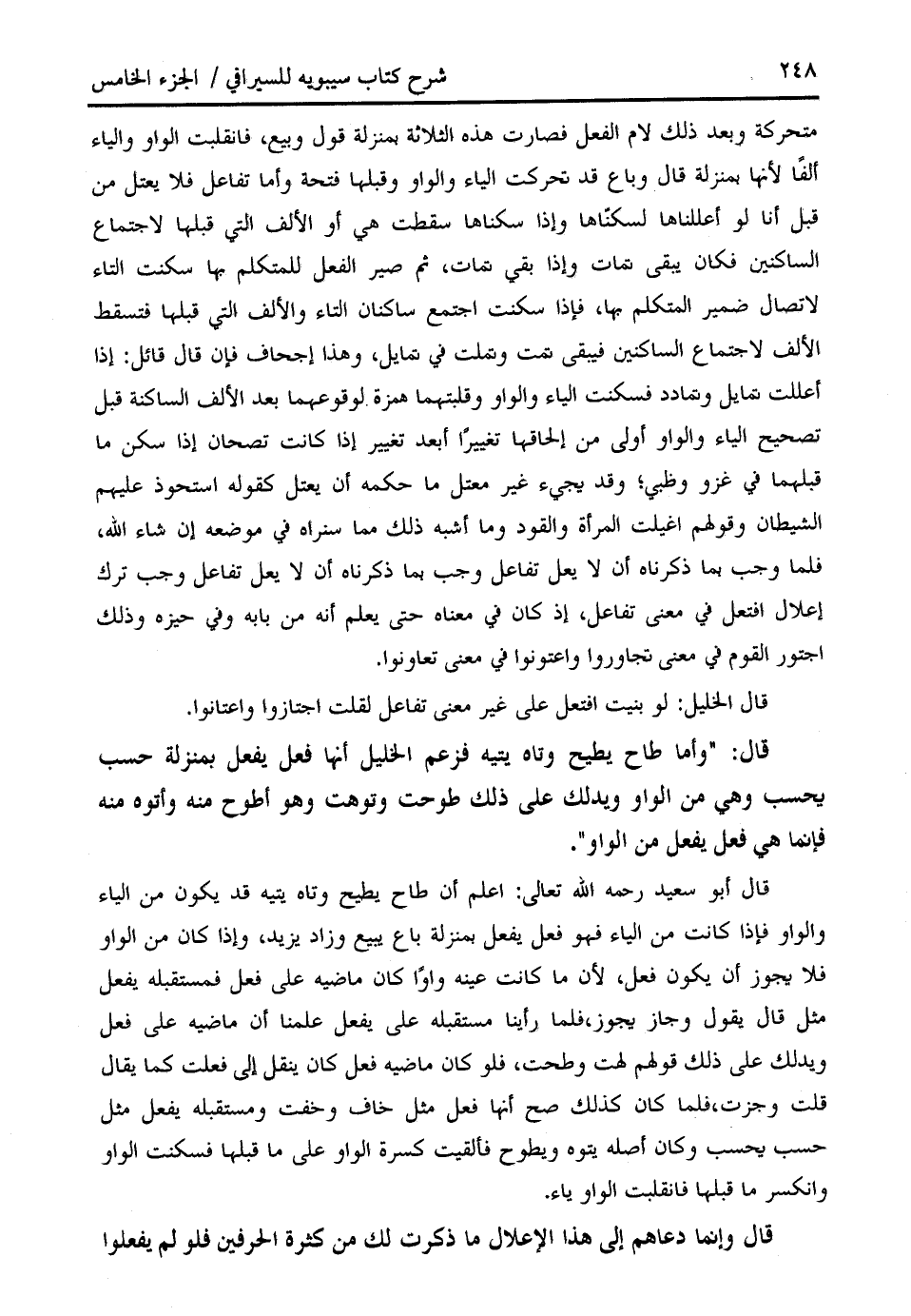 قال أبو سعيد رحمه الله تعالى: اعلم أن طاح يطيح وتاه يتيه قد يكون من الياء والواو فإذا كانت من الياء فهو فعل يفعل بمنزلة باع يبيع وزاد يزيد، وإذا كان من الواو فلا يجوز أن يكون فعل، لأن ما كانت عينه واوا كان ماضيه على فعل فمستقبله يفعل مثل قال يقول وجاز يجوز، فلما رأينا مستقبله على يفعل علمنا أن ماضيه على فعل ويدلك على ذلك قولهم لهت وطحت، فلو كان ماضيه فعل كان ينقل إلى فعلت كما يقال قلت وجزت، فلما كان كذلك صح أنها فعل مثل خاف وخفت ومستقبله يفعل مثل حسب يحسب وكان أصله يتوه ويطوح فألقيت كسرة الواو على ما قبلها فسكنت الواو وانكسر ما قبلها فانقلبت الواو ياء.