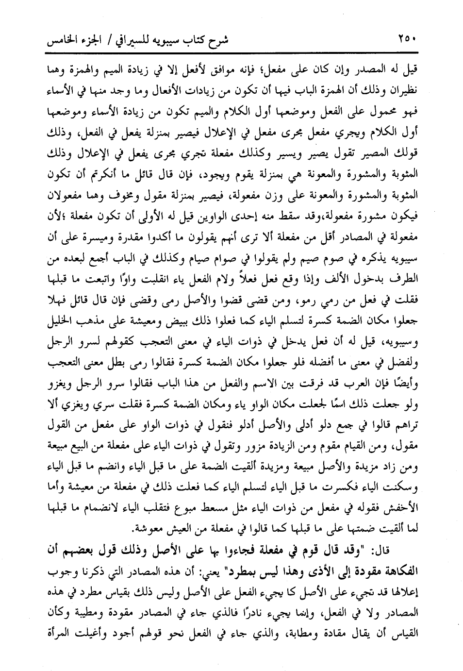 قيل له المصدر وإن كان على مفعل؛ فإنه موافق لأفعل إلا في زيادة الميم والهمزة وهما نظيران وذلك أن الهمزة الباب فيها أن تكون من زيادات الأفعال وما وجد منها في الأسماء فهو محمول على الفعل وموضعها أول الكلام والميم تكون من زيادة الأسماء وموضعها أول الكلام ويجري مفعل مجرى مفعل في الإعلال فيصير بمنزلة يفعل في الفعل، وذلك قولك المصير تقول يصير ويسير وكذلك مفعلة تجري مجرى يفعل في الإعلال وذلك المثوبة والمشورة والمعونة هي بمنزلة يقوم ويجود، فإن قال قائل ما أنكرتم أن تكون المثوبة والمشورة والمعونة على وزن مفعولة، فيصير بمنزلة مقول ومخوف وهما مفعولان فيكون مشورة مفعولة، وقد سقط منه إحدى الواوين قيل له الأولى أن تكون مفعلة؛ لأن مفعولة في المصادر أقل من مفعلة ألا ترى أنهم يقولون ما أكدوا مقدرة وميسرة على أن سيبويه يذكره في صوم صيم ولم يقولوا في صوام صيام وكذلك في الباب أجمع لبعده من الطرف بدخول الألف وإذا وقع فعل فعلا ولام الفعل ياء انقلبت واوا واتبعت ما قبلها فقلت في فعل من رمي رمو، ومن قضى قضوا والأصل رمى وقضى فإن قال قائل فهلا جعلوا مكان الضمة كسرة لتسلم الياء كما فعلوا ذلك ببيض ومعيشة على مذهب الخليل وسيبويه، قيل له أن فعل يدخل في ذوات الياء في معنى التعجب كقولهم لسرو الرجل ولفضل في معنى ما أفضله فلو جعلوا مكان الضمة كسرة فقالوا رمى بطل معنى التعجب وأيضا فإن العرب قد فرقت بين الاسم والفعل من هذا الباب فقالوا سرو الرجل ويغزو ولو جعلت ذلك اسما لجعلت مكان الواو ياء ومكان الضمة كسرة فقلت سري ويغزي ألا تراهم قالوا في جمع دلو أدلى والأصل أدلو فنقول في ذوات الواو على مفعل من القول مقول، ومن القيام مقوم ومن الزيادة مزور وتقول في ذوات الياء على مفعلة من البيع مبيعة ومن زاد مزيدة والأصل مبيعة ومزيدة ألقيت الضمة على ما قبل الياء وانضم ما قبل الياء وسكنت الياء فكسرت ما قبل الياء لتسلم الياء كما فعلت ذلك في مفعلة من معيشة وأما الأخفش فقوله في مفعل من ذوات الياء مثل مسعط مبوع فتقلب الياء لانضمام ما قبلها لما ألقيت ضمتها على ما قبلها كما قالوا في مفعلة من العيش معوشة.