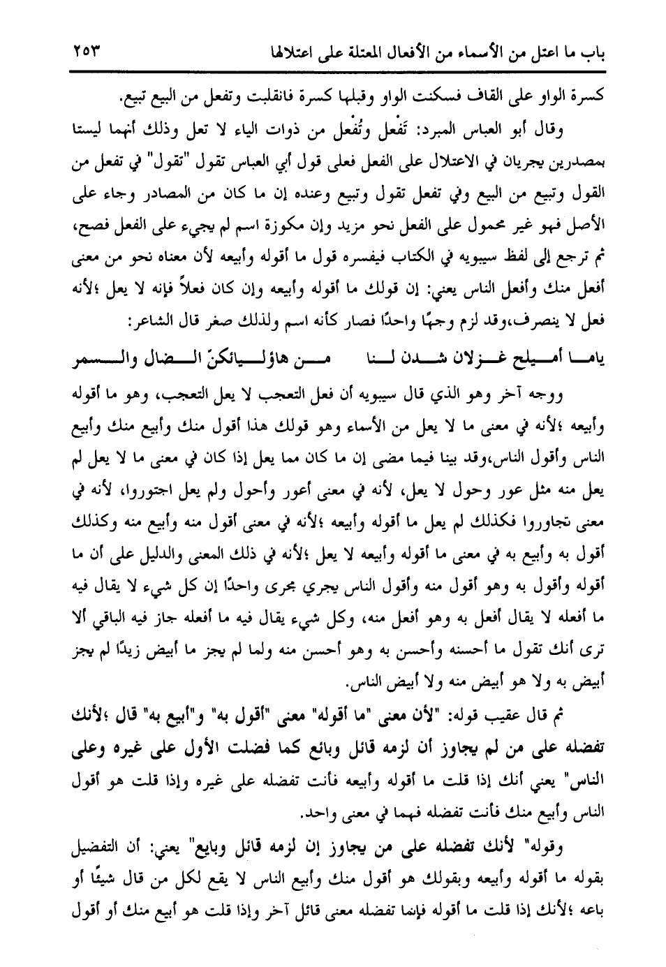 ووجه آخر وهو الذي قال سيبويه أن فعل التعجب لا يعل التعجب، وهو ما أقوله وأبيعه؛ لأنه في معنى ما لا يعل من الأسماء وهو قولك هذا أقول منك وأبيع منك وأبيع الناس وأقول الناس، وقد بينا فيما مضى إن ما كان مما يعل إذا كان في معنى ما لا يعل لم يعل منه مثل عور وحول لا يعل، لأنه في معنى أعور وأحول ولم يعل اجتوروا، لأنه في معنى تجاوروا فكذلك لم يعل ما أقوله وأبيعه؛ لأنه في معنى أقول منه وأبيع منه وكذلك أقول به وأبيع به في معنى ما أقوله وأبيعه لا يعل؛ لأنه في ذلك المعنى والدليل على أن ما أقوله وأقول به وهو أقول منه وأقول الناس يجري مجرى واحدا إن كل شيء لا يقال فيه ما أفعله لا يقال أفعل به وهو أفعل منه، وكل شيء يقال فيه ما أفعله جاز فيه الباقي ألا ترى أنك تقول ما أحسنه وأحسن به وهو أحسن منه ولما لم يجز ما أبيض زيدا لم يجز أبيض به ولا هو أبيض منه ولا أبيض الناس.