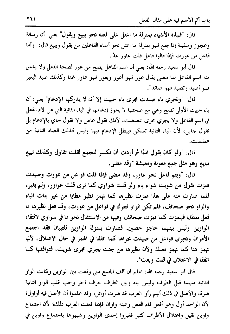 قال: " فهذه الأشياء بمنزلة ما اعتل على فعله نحو يبيع ويقول " يعني: أن رسالة وعجوز وسفينة إذا جمع فهو بمنزلة ما اعتل نحو أسماء الفاعلين من يقول ويبيع قال: " وأما فاعل من عورت فإذا قالوا فاعل قلت عاور غدا.