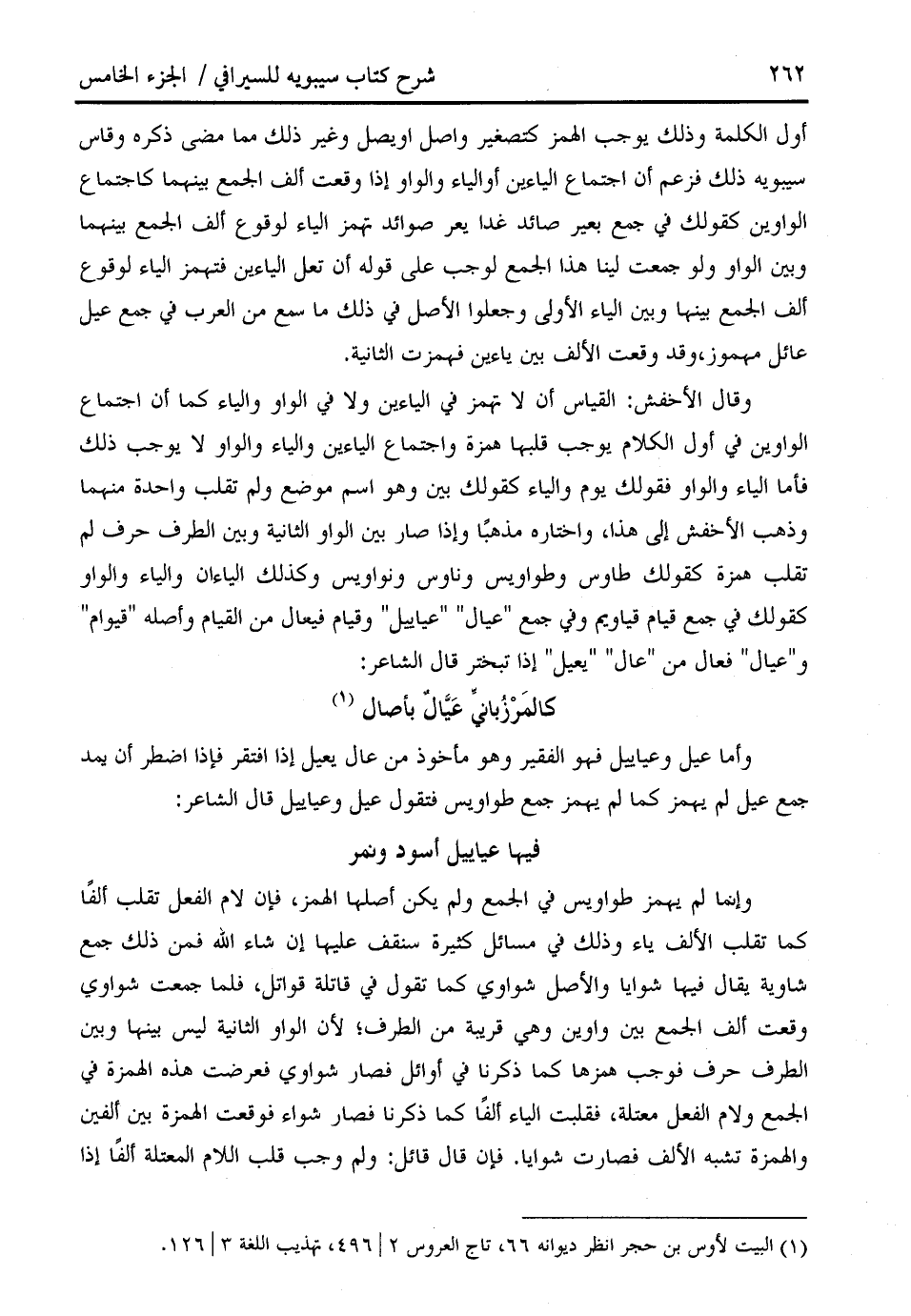 وإنما لم يهمز طواويس في الجمع ولم يكن أصلها الهمز، فإن لام الفعل تقلب ألفا كما تقلب الألف ياء وذلك في مسائل كثيرة سنقف عليها إن شاء الله فمن ذلك جمع شاوية يقال فيها شوايا والأصل شواوي كما تقول في قاتلة قواتل، فلما جمعت شواوي وقعت ألف الجمع بين واوين وهي قريبة من الطرف؛ لأن الواو الثانية ليس بينها وبين الطرف حرف فوجب همزها كما ذكرنا في أوائل فصار شواوي فعرضت هذه الهمزة في الجمع ولام الفعل معتلة، فقلبت الياء ألفا كما ذكرنا فصار شواء فوقعت الهمزة بين ألفين والهمزة تشبه الألف فصارت شوايا. فإن قال قائل: ولم وجب قلب اللام المعتلة ألفا إذا