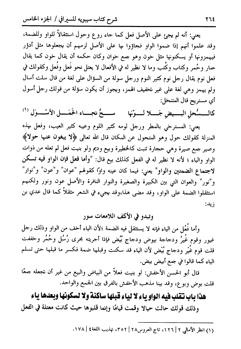 يعني: المسترخي بالمطر ورجل لومه كثير اللوم وعيبه كثير العيب، وفعل بهذه المنزلة كقولك حول وهو المتحول عن المكان قال الله تعالى لا يَبْغُونَ عَنْها حِوَلًا وصير جمع صيرة وهي حجارة تنبت كالخطيرة وبيع وديم ولو بنيت فعل لم تعله من ذوات الواو والياء؛ لأنه لا نظير له في الفعل كذلك بيع قال: " وأما فعل فإن الواو فيه تسكن لاجتماع الضمتين والواو " يعني: فيما كان عينه واوا كقولهم " عوان " و " عون " و " نوار " و " نور " والعوان التي بين الكبيرة والصغيرة والنوار النافرة والأصل عون ونور ولكنهم استثقلوا الضمة على الواو، وقد مضى هذا، وقد يجيء في الشعر مثقلا كما قال عدي بن زيد:
