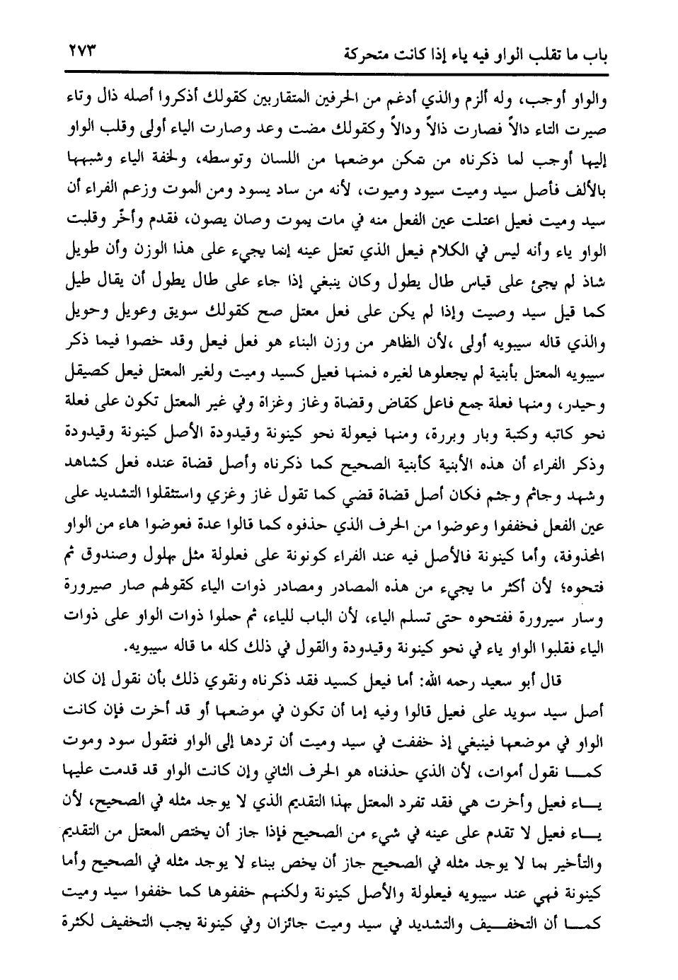 قال أبو سعيد رحمه الله: أما فيعل كسيد فقد ذكرناه ونقوي ذلك بأن نقول إن كان أصل سيد سويد على فعيل قالوا وفيه إما أن تكون في موضعها أو قد أخرت فإن كانت الواو في موضعها فينبغي إذ خففت في سيد وميت أن تردها إلى الواو فتقول سود وموت كما نقول أموات، لأن الذي حذفناه هو الحرف الثاني وإن كانت الواو قد قدمت عليها ياء فعيل وأخرت هي فقد تفرد المعتل بهذا التقديم الذي لا يوجد مثله في الصحيح، لأن ياء فعيل لا تقدم على عينه في شيء من الصحيح فإذا جاز أن يختص المعتل من التقديم والتأخير بما لا يوجد مثله في الصحيح جاز أن يخص ببناء لا يوجد مثله في الصحيح وأما كينونة فهي عند سيبويه فيعلولة والأصل كينونة ولكنهم خففوها كما خففوا سيد وميت كما أن التخفيف والتشديد في سيد وميت جائزان وفي كينونة يجب التخفيف لكثرة