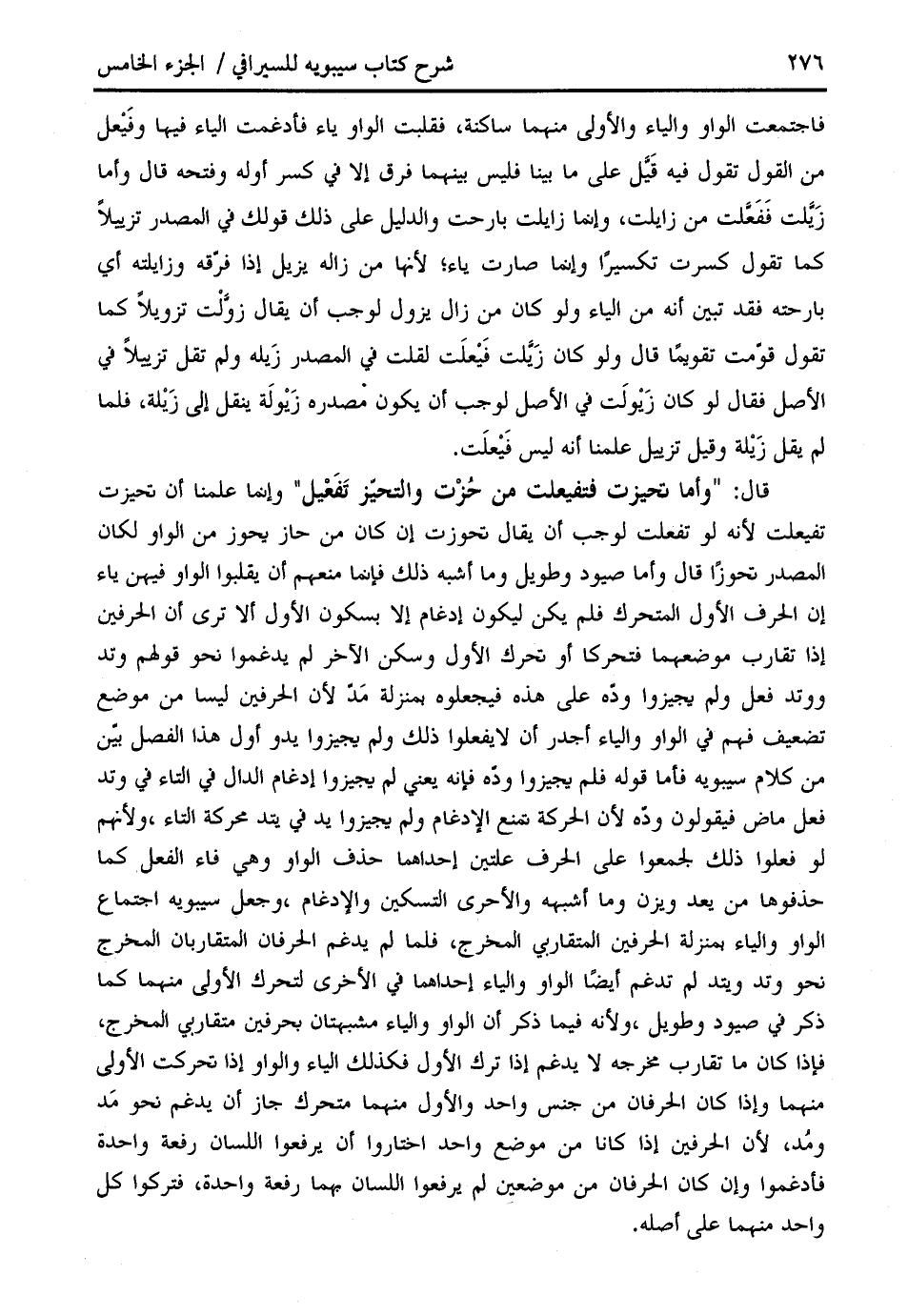 قال: " وأما تحيزت فتفيعلت من حزت والتحيّز تفعيل " وإنما علمنا أن تحيزت تفيعلت لأنه لو تفعلت لوجب أن يقال تحوزت إن كان من حاز يحوز من الواو لكان المصدر تحوزا قال وأما صيود وطويل وما أشبه ذلك فإنما منعهم
