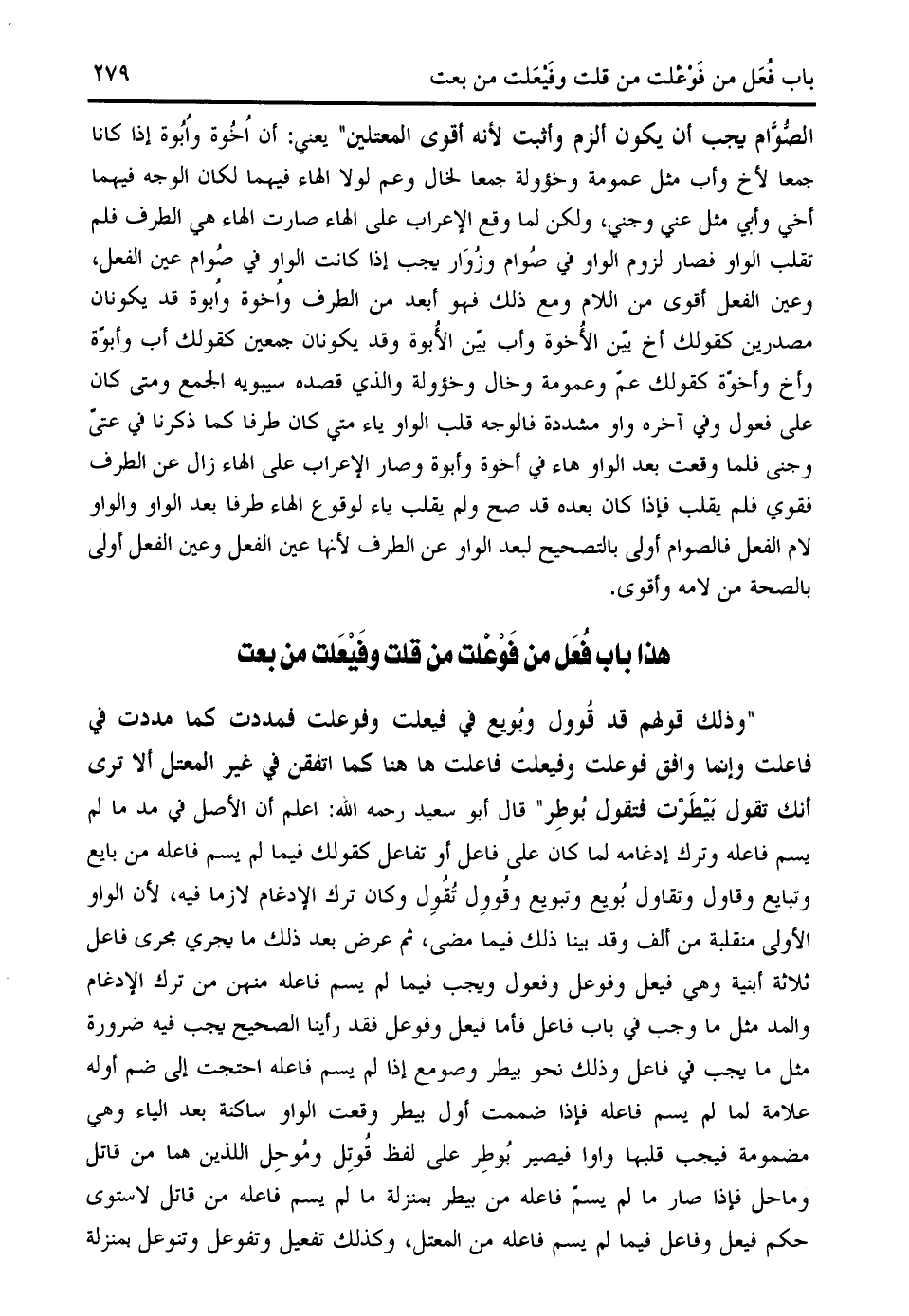 " وذلك قولهم قد قوول وبويع في فيعلت وفوعلت فمددت كما مددت في فاعلت وإنما وافق فوعلت وفيعلت فاعلت ها هنا كما اتفقن في غير المعتل ألا ترى أنك تقول بيطرت فتقول بوطر " قال أبو سعيد رحمه الله: اعلم أن الأصل في مد ما لم يسم فاعله وترك إدغامه لما كان على فاعل أو تفاعل كقولك فيما لم يسم فاعله من بايع وتبايع وقاول وتقاول بويع وتبويع وقوول تقول وكان ترك الإدغام لازما فيه، لأن الواو الأولى منقلبة من ألف وقد بينا ذلك فيما مضى، ثم عرض بعد ذلك ما يجري مجرى فاعل ثلاثة أبنية وهي فيعل وفوعل وفعول ويجب فيما لم يسم فاعله منهن من ترك الإدغام والمد مثل ما وجب في باب فاعل فأما فيعل وفوعل فقد رأينا الصحيح يجب فيه