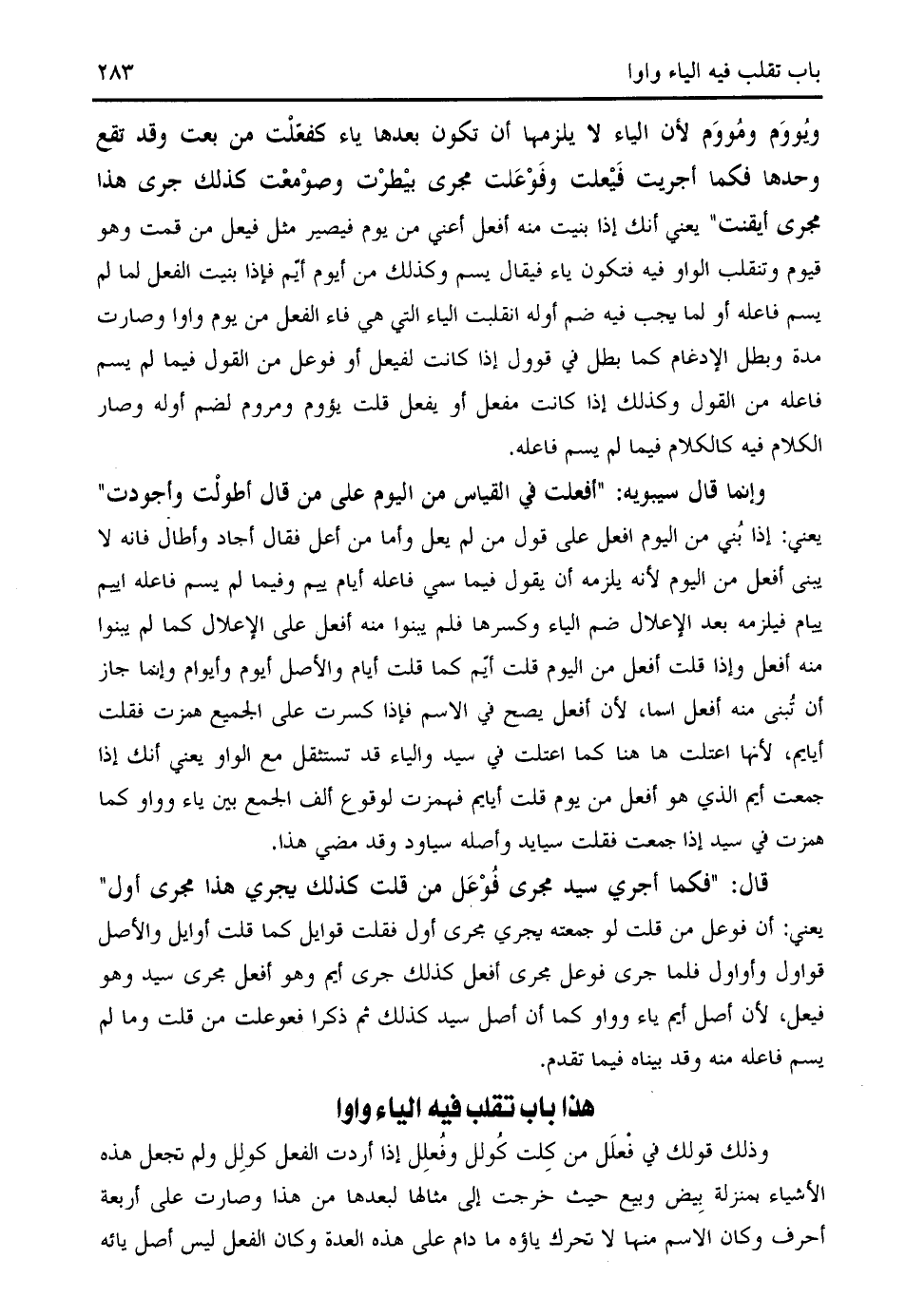 ويووم ومووم لأن الياء لا يلزمها أن تكون بعدها ياء كفعّلت من بعت وقد تقع وحدها فكما أجريت فيعلت وفوعلت مجرى بيطرت وصومعت كذلك جرى هذا مجرى أيقنت " يعني أنك إذا بنيت منه أفعل أعني من يوم فيصير مثل فيعل من قمت وهو قيوم وتنقلب الواو فيه فتكون ياء فيقال يسم وكذلك من أيوم أيّم فإذا بنيت الفعل لما لم يسم فاعله أو لما يجب فيه ضم أوله انقلبت الياء التي هي فاء الفعل من يوم واوا وصارت مدة وبطل الإدغام كما بطل في قوول إذا كانت لفيعل أو فوعل من القول فيما لم يسم فاعله من القول وكذلك إذا كانت مفعل أو يفعل قلت يؤوم ومروم لضم أوله وصار الكلام فيه كالكلام فيما لم يسم فاعله.