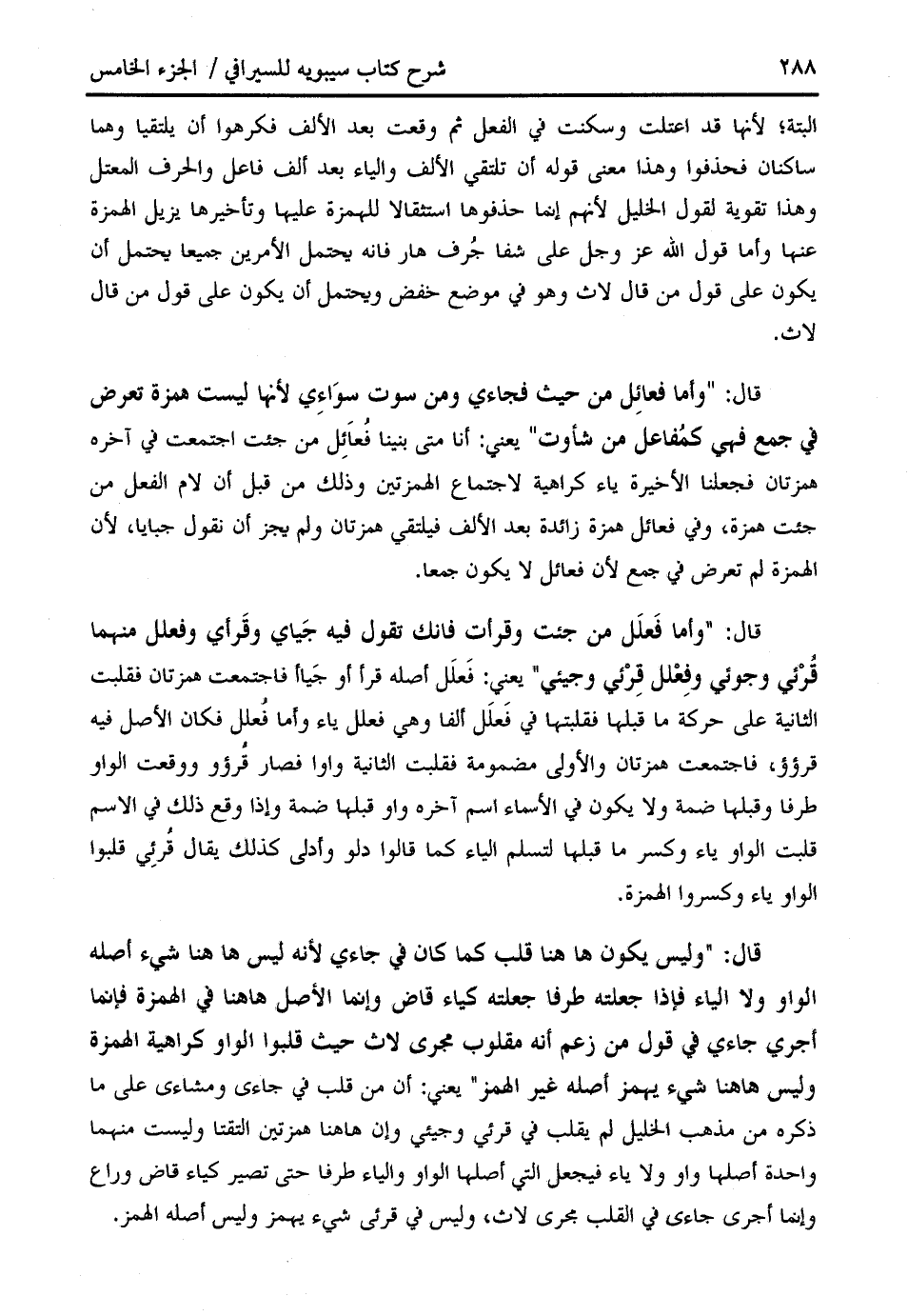 قال: " وليس يكون ها هنا قلب كما كان في جاءي لأنه ليس ها هنا شيء أصله الواو ولا الياء فإذا جعلته طرفا جعلته كياء قاض وإنما الأصل هاهنا في الهمزة فإنما أجري جاءي في قول من زعم أنه مقلوب مجرى لاث حيث قلبوا الواو كراهية الهمزة وليس هاهنا شيء يهمز أصله غير الهمز " يعني: أن من قلب في جاءى ومشاءى على ما ذكره من مذهب الخليل لم يقلب في قرئي وجيئي وإن هاهنا همزتين التقتا وليست منهما واحدة أصلها واو ولا ياء فيجعل التي أصلها الواو والياء طرفا حتى تصير كياء قاض وراع وإنما أجرى جاءى في القلب مجرى لاث، وليس في قرئى شيء يهمز وليس أصله الهمز.