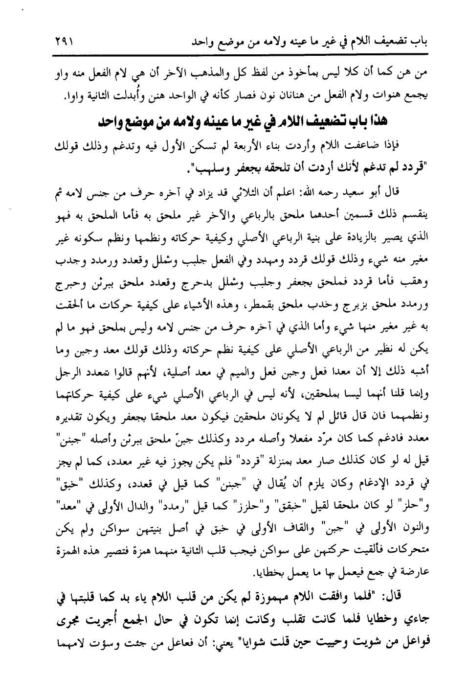 قال أبو سعيد رحمه الله: اعلم أن الثلاثي قد يزاد في آخره حرف من جنس لامه ثم ينقسم ذلك قسمين أحدهما ملحق بالرباعي والآخر غير ملحق به فأما الملحق به فهو الذي يصير بالزيادة على بنية الرباعي الأصلي وكيفية حركاته ونظمها ونظم سكونه غير مغير منه شيء وذلك قولك قردد ومهدد وفي الفعل جلبب وشملل وقعدد ورمدد وجدب وهقب فأما قردد فملحق بجعفر وجلبب وشملل بدحرج وقعدد ملحق ببرثن وحبرج ورمدد ملحق بزبرج وخدب ملحق بقمطر، وهذه الأشياء على كيفية حركات ما ألحقت به غير مغير منها شيء وأما الذي في آخره حرف من جنس لامه وليس بملحق فهو ما لم يكن له نظير من الرباعي الأصلي على كيفية نظم حركاته وذلك قولك معد وجبن وما أشبه ذلك إلا أن معدا فعل وجبن فعل والميم في معد أصلية، لأنهم قالوا تمعدد الرجل وإنما قلنا أنهما ليسا بملحقين، لأنه ليس في الرباعي الأصلي شيء على كيفية حركاتهما ونظمهما فان قال قائل لم لا يكونان ملحقين فيكون معد ملحقا بجعفر ويكون تقديره معدد فادغم كما كان مرّد مفعلا وأصله مردد وكذلك جبنّ ملحق ببرثن وأصله " جبنن " قيل له لو كان كذلك صار معد بمنزلة " قردد " فلم يكن يجوز فيه غير معدد، كما لم يجز في قردد الإدغام وكان يلزم أن يقال في " جبنن " كما قيل في قعدد، وكذلك " خبق " و " حلز " لو كان ملحقا لقيل " خبقق " و " حلزز " كما قيل " رمدد " والدال الأولى في " معد " والنون الأولى في " جبن " والقاف الأولى في خبق في أصل بنيتهن سواكن ولم يكن متحركات فألقيت حركتهن على سواكن فيجب قلب الثانية منهما همزة فتصير هذه الهمزة عارضة في جمع فيعمل بها ما يعمل بخطايا.