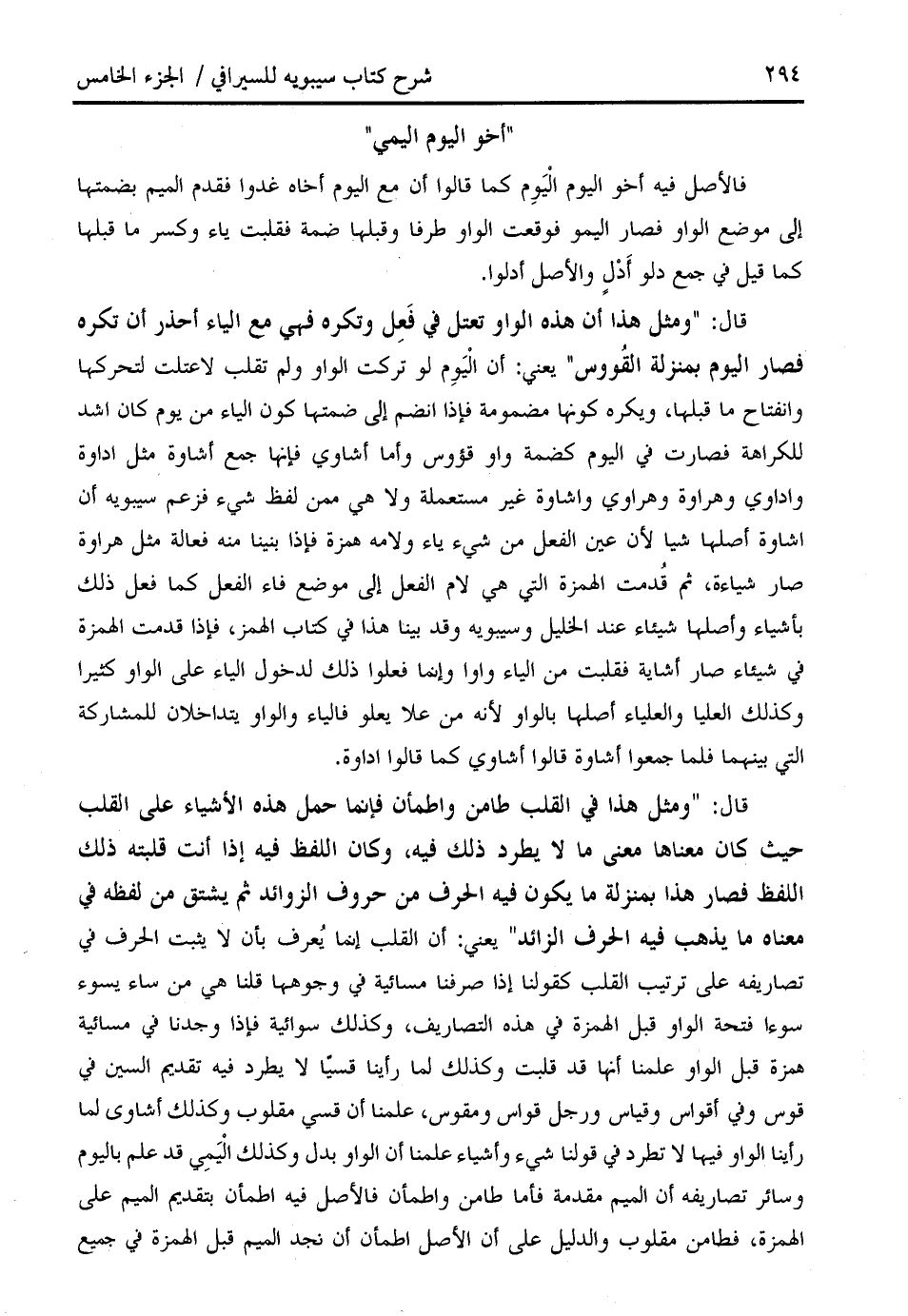 فالأصل فيه أخو اليوم اليوم كما قالوا أن مع اليوم أخاه غدوا فقدم الميم بضمتها إلى موضع الواو فصار اليمو فوقعت الواو طرفا وقبلها ضمة فقلبت ياء وكسر ما قبلها كما قيل في جمع دلو أدل والأصل أدلوا.