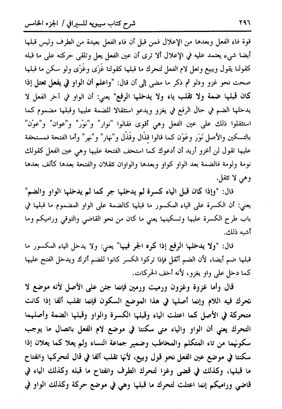 قال وأما غزوة وغزون ورميت ورمين فإنما جئن على الأصل لأنه موضع لا تحرك فيه اللام وإنما أصلها في هذا الموضع السكون فإنما تقلب ألفا إذا كانت متحركة في الأصل كما اعتلت الياء وقبلها الكسرة والواو وقبلها الضمة وأصلهما التحرك يعني أن الواو والياء متى سكنتا في موضع لام الفعل باتصال ما يوجب سكونهما من تاء المتكلم والمخاطب وضمير جماعة النساء ولم يعلا كما يعلان إذا سكنتا في موضع عين الفعل نحو قول وبيع، لأنها تقلب ألفا في قال لتحركها وانفتاح ما قبلها، وكذلك في قضى وغزا لتحرك الطرف وانفتاح ما قبله وكذلك الياء في قاضي وراميكم إنما اعتلت لتحرك ما قبلها وهي في موضع حركة وكذلك الواو في