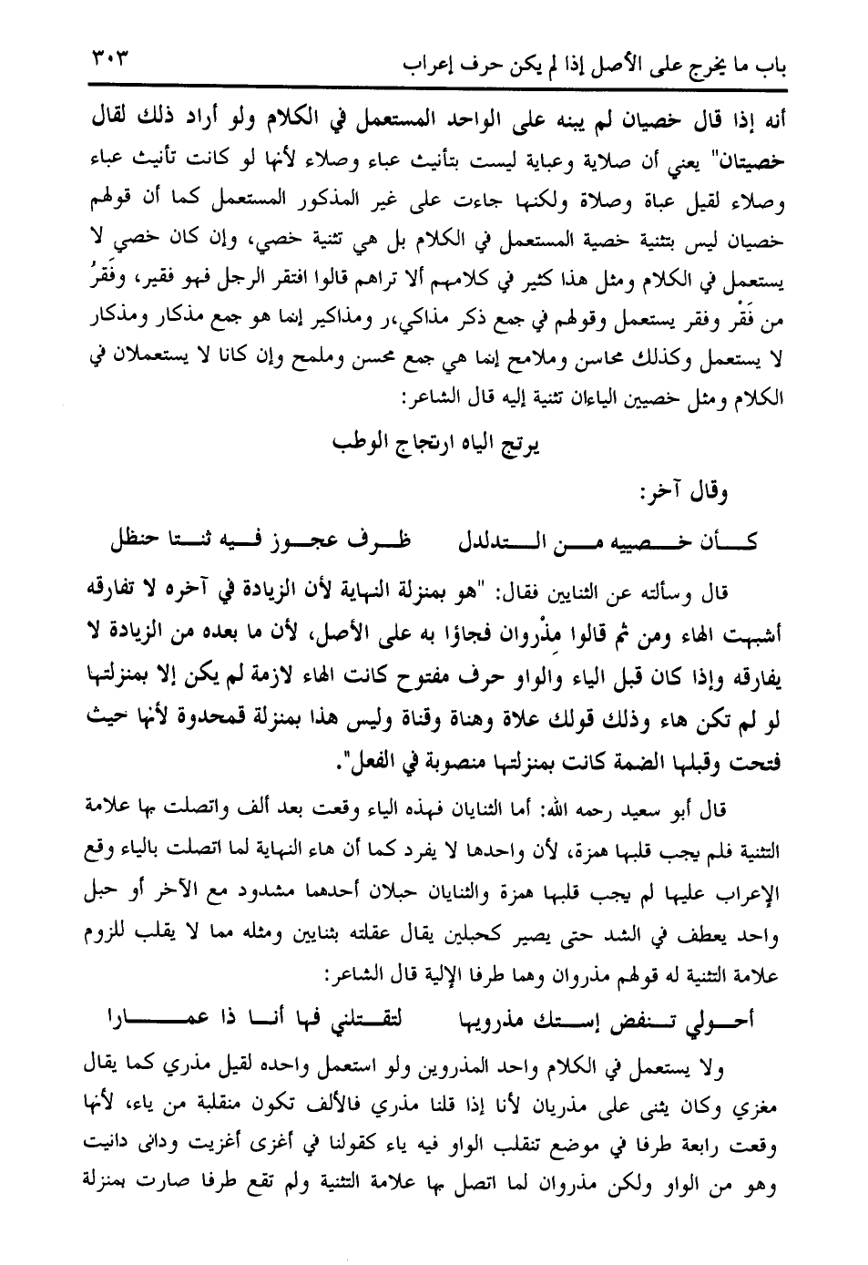 قال وسألته عن الثنايين فقال: " هو بمنزلة النهاية لأن الزيادة في آخره لا تفارقه أشبهت الهاء ومن ثم قالوا مذروان فجاؤا به على الأصل، لأن ما بعده من الزيادة لا يفارقه وإذا كان قبل الياء والواو حرف مفتوح كانت الهاء لازمة لم يكن إلا بمنزلتها لو لم تكن هاء وذلك قولك علاة وهناة وقناة وليس هذا بمنزلة قمحدوة لأنها حيث فتحت وقبلها الضمة كانت بمنزلتها منصوبة في الفعل ".