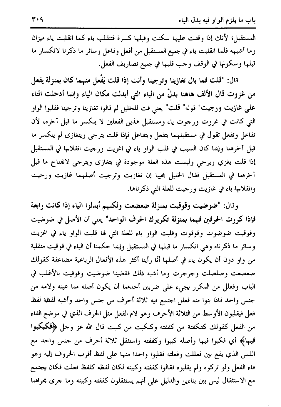 قال: " قلت فما بال تغازينا وترجينا وأنت إذا قلت يفعل منهما كان بمنزلة يفعل من غزوت قال الألف هاهنا بدل من الياء التي أبدلت مكان الياء وإنما أدخلت التاء على غازيت ورجيت " قوله " قلت " يعني قت للخليل لم قالوا تغازينا وترجينا فقلبوا الواو التي كانت في غزوت ورجوت ياء ومستقبل هذين الفعلين لا ينكسر ما قبل آخره، لأن تفاعل وتفعل تقول في مستقبلهما يتفعل ويتفاعل فإذا قلت يترجى ويتغازى لم ينكسر ما قبل آخرهما وإنما كان السبب في قلب الواو ياء في اغزيت ورجيت انقلابها في المستقبل إذا قلت يغزي ويرجي وليست هذه العلة موجودة في يتغازى ويترجى لانفتاح ما قبل آخرهما في المستقبل فقال الخليل مجيبا إن تغازيت وترجيت أصلهما غازيت ورجيت وانقلابها ياء في غازيت ورجيت للعلة التي ذكرناها.