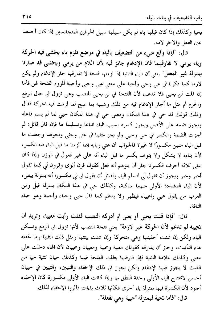 قال: " فإذا قلت يحيى أو يعيى ثم أدركه النصب فقلت رأيت معييا، وتريد أن تجيبه لم تدغم لأن الحركة غير لازمة " يعني فتحة النصب لأنها تزول في الرفع وتسكن الياء ولكن إن شئت أخفيتها وهي متحركة وإن شئت بينتها ومثل ذلك التثنية وما لحقته هاء التأنيث، وجاز أن يفارقه كقولك معيية ومحيية ومعييان ومحييان لأن الهاء دخلت على معيي وكذلك علامة التثنية فإذا فارقتها بطلت الفتحة فيها وكذلك حيان تثنية حيا من الغيث لا يجوز فيها الإدغام ولكن يجوز في ذلك الإخفاء والتبيين، والتبيين في حييان أحسن لانفتاح الياء الأولى وخفة النطق بها وإذا كانت الياء الأولى مكسورة كان الإخفاء أجود لأن الكسرة فيها بمنزلة ياء أخرى فكأنها ثلاث ياءات فآثروا الإخفاء لذلك.