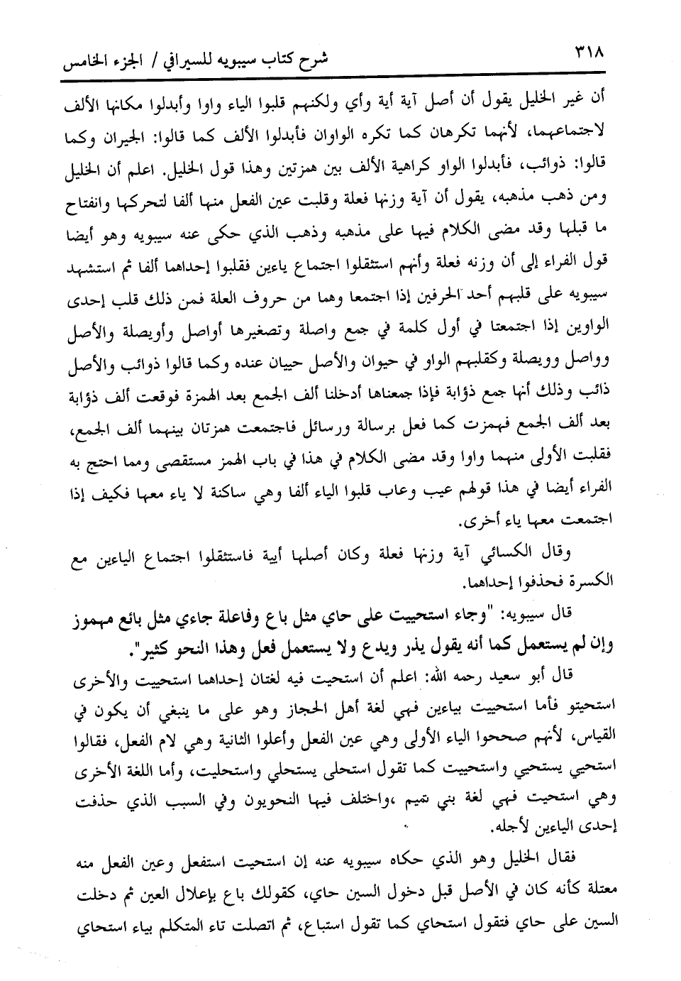 أن غير الخليل يقول أن أصل آية أية وأي ولكنهم قلبوا الياء واوا وأبدلوا مكانها الألف لاجتماعهما، لأنهما تكرهان كما تكره الواوان فأبدلوا الألف كما قالوا: الجيران وكما قالوا: ذوائب، فأبدلوا الواو كراهية الألف بين همزتين وهذا قول الخليل. اعلم أن الخليل ومن ذهب مذهبه، يقول أن آية وزنها فعلة وقلبت عين الفعل منها ألفا لتحركها وانفتاح ما قبلها وقد مضى الكلام فيها على مذهبه وذهب الذي حكى عنه سيبويه وهو أيضا قول الفراء إلى أن وزنه فعلة وأنهم استثقلوا اجتماع ياءين فقلبوا إحداهما ألفا ثم استشهد سيبويه على قلبهم أحد الحرفين إذا اجتمعا وهما من حروف العلة فمن ذلك قلب إحدى الواوين إذا اجتمعتا في أول كلمة في جمع واصلة وتصغيرها أواصل وأويصلة والأصل وواصل وويصلة وكقلبهم الواو في حيوان والأصل حييان عنده وكما قالوا ذوائب والأصل ذائب وذلك أنها جمع ذؤابة فإذا جمعناها أدخلنا ألف الجمع بعد الهمزة فوقعت ألف ذؤابة بعد ألف الجمع فهمزت كما فعل برسالة ورسائل فاجتمعت همزتان بينهما ألف الجمع، فقلبت الأولى منهما واوا وقد مضى الكلام في هذا في باب الهمز مستقصى ومما احتج به الفراء أيضا في هذا قولهم عيب وعاب قلبوا الياء ألفا وهي ساكنة لا ياء معها فكيف إذا اجتمعت معها ياء أخرى.