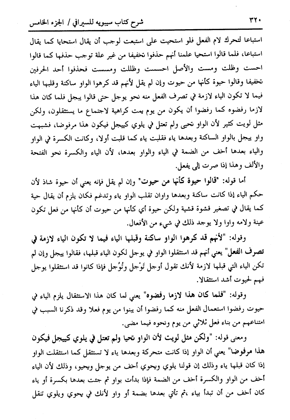 ومعنى قوله: " ولكن مثل لويت لأن الواو تحيا ولم تعتل في يلوي كييجل فيكون هذا مرفوضا " يعني أن الواو إذا كانت متحركة وبعدها ياء لا تستثقل كما استثقلت الواو إذا كان قبلها ياء وذلك إن قولنا يلوي ويحوي أخف من يوجل ويحيو، وذلك لأن الياء أخف من الواو والكسرة أخف من الضمة فإذا بدأت بواو ثم جئت بعدها بكسرة أو ياء كان أخف من أن تبدأ بياء، ثم تأتي بعدها بضمة أو واو لأنك في يحوي ويلوي تنقل