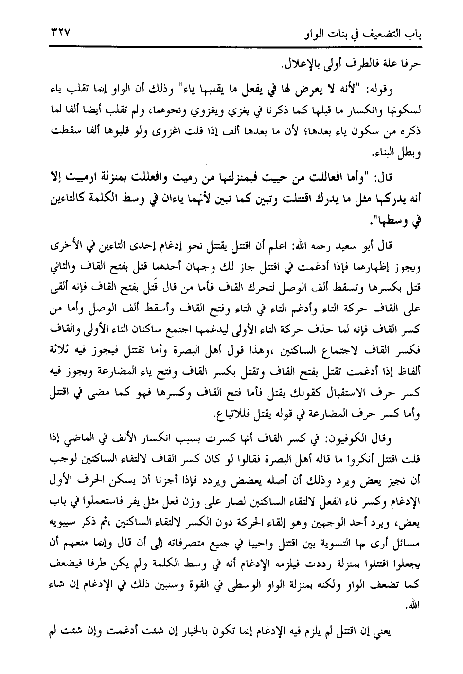 قال أبو سعيد رحمه الله: اعلم أن اقتتل يقتتل نحو إدغام إحدى التاءين في الأخرى ويجوز إظهارهما فإذا أدغمت في اقتتل جاز لك وجهان أحدهما قتل بفتح القاف والثاني قتل بكسرها وتسقط ألف الوصل لتحرك القاف فأما من قال قتل بفتح القاف فإنه ألقى على القاف حركة التاء وأدغم التاء في التاء وفتح القاف وأسقط ألف الوصل وأما من كسر القاف فإنه لما حذف حركة التاء الأولى ليدغمها اجتمع ساكنان التاء الأولى والقاف فكسر القاف لاجتماع الساكنين، وهذا قول أهل البصرة وأما تقتتل فيجوز فيه ثلاثة ألفاظ إذا أدغمت تقتل بفتح القاف وتقتل بكسر القاف وفتح ياء المضارعة ويجوز فيه كسر حرف الاستقبال كقولك يقتل فأما فتح القاف وكسرها فهو كما مضى في اقتتل وأما كسر حرف المضارعة في قوله يقتل فللاتباع.