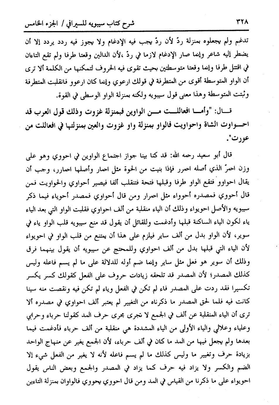 قال أبو سعيد رحمه الله: قد كنا بينا جواز اجتماع الواوين في احووي وهو على وزن احمرّ الذي أصله احمرر فإذا بنيت من الحوة مثل احمار وأصلها احمارر، وجب أن يقال احواوو فتقع الواو طرفا وقبلها فتحة فتنقلب ألفا فيصير أحواوي والحواويت فمن قال أحووي فمصدره أحوواء مثل احمرار ومن قال أحواوي فمصدر أحوياء فيما ذكر سيبويه والأصل احويواء وذلك أن الياء منقلبة من ألف احواوي فقلبت الواو التي بعد الياء ياء لكون الياء الساكنة قبلها وأدغمت وللقائل أن يقول قد منع سيبويه قلب الواو ياء في سوير، لأن الواو بدل من ألف ساير فيلزم على هذا أن يمتنع من قلب الواو في احويواء لأن الياء التي قبلها بدل من ألف احواوي وللمحتج عن سيبويه أن يقول بينهما فرق وذلك أن سوير هو فعل مثل ساير وإنما ضم أوله للدلالة على ما لم يسم فاعله وليس كذلك المصدر؛ لأن المصدر قد تلحقه زيادات حروف على الفعل كقولك كسر يكسر تكسيرا فقد ردت على المصدر فاء لم تكن في الفعل وياء لم تكن فيه ونقصت منه سينا كانت فيه فلما لحق المصدر ما ذكرناه من التغيير لم يعتبر ألف احواوي في مصدره ألا ترى أن الياء المنقلبة عن ألف في الجمع لا تجرى مجرى حرف المد كقولنا حرباء وحرابي وعلياء وعلالي والياء الأولى من الياء المشددة هي منقلبة من ألف حرباء فأدغمت فيما بعدها ولم يجعل فيها من المد ما كان في ألف حرباء، لأن الجمع بغير عن منهاج الواحد بزيادة حرف وتغيير ما وليس كذلك ما لم يسم فاعله لأنه لا يغير من الفعل شيء إلا الضم والكسر ولا يزاد فيه حرف كما يزاد في المصدر والجمع وبعض الناس يقول احويواء على ما ذكرنا من القياس في المد ومن قال احووي يحووي فالواوان بمنزلة التاءين