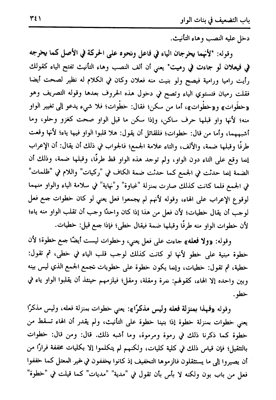 وقوله: " لأنهما يخرجان الياء في فاعل ونحوه على الحركة في الأصل كما يخرجه في فيعلان لو جاءت في رميت " يعني أن ألف النصب وهاء التأنيث تفتح الياء كقولك رأيت راميا ورامية فيصح ولو بنيت منه فعلان وكان في الكلام له نظير لصحت أيضا فقلت رميان فتستوي الياء وتصح في دخول هذه الحروف بعدها وقوله التصريف وهو «خطوات» و «خطوات»، أما من سكن؛ فقال: خطوات؛ فلا شيء يدعو إلى تغيير الواو منه؛ لأنها واو قبلها حرف ساكن، وإذا سكن ما قبل الواو صحت كغزو وحلو، وما أشبههما، وأما من قال: خطوات؛ فللقائل أن يقول: هلا قلبوا الواو فيها ياء؛ لأنها وقعت طرفا وقبلها ضمة، والألف، والتاء علامة الجمع؛ فالجواب في ذلك أن يقال: أن الإعراب إنما وقع على التاء دون الواو، ولم توجد هذه الواو قط طرفا، وقبلها ضمة، وذلك أن الضمة إنما حدثت في الجمع كما حدثت ضمة الكاف في " ركيات " واللام في " ظلمات " في الجمع فلما كانت كذلك صارت بمنزلة "