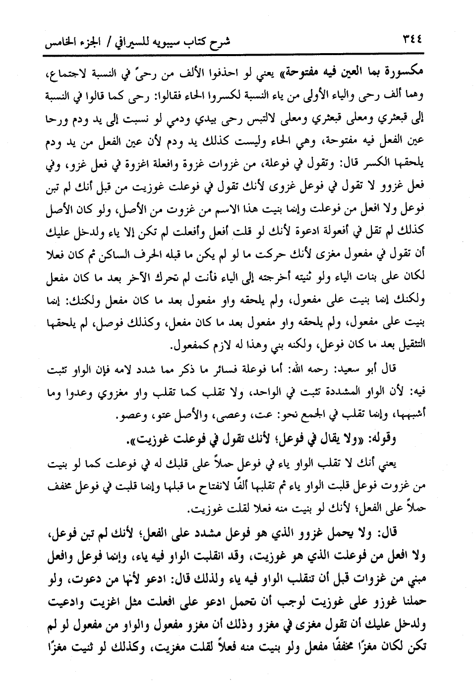 قال أبو سعيد: رحمه الله: أما فوعلة فسائر ما ذكر مما شدد لامه فإن الواو تثبت فيه: لأن الواو المشددة تثبت في الواحد، ولا تقلب كما تقلب واو مغزوي وعدوا وما أشبهها، وإنما تقلب في الجمع نحو: عت، وعصى، والأصل عتو، وعصو.