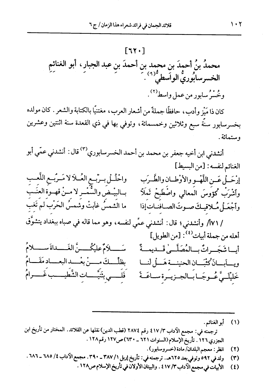 أنشدني ابن أخيه جعفر بن محمد بن أحمد الخسرسابوري قال: أنشدني عمي أبو الغنائم لنفسه: [من البسيط]