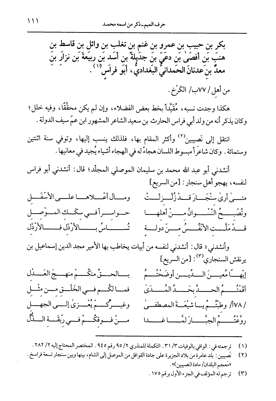 أنشدني أبو عبد الله محمد بن سليمان الموصلي المجلد؛ قال: أنشدني أبو فراس لنفسه، يهجو أهل سنجار: [من السريع]