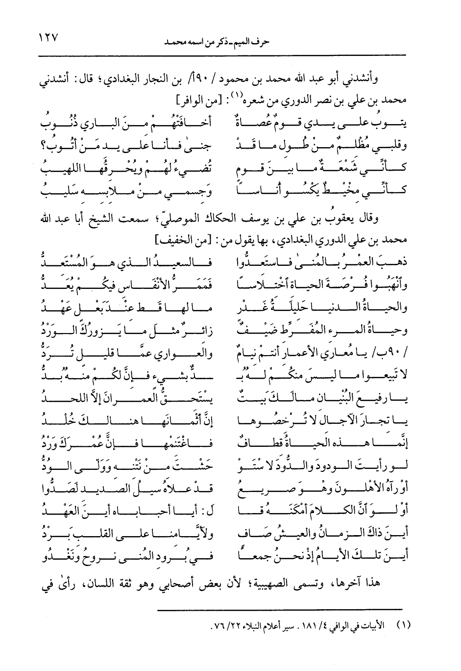 وأنشدني أبو عبد الله محمد بن محمود بن النجار البغدادي، قال: أنشدني محمد بن علي بن نصر الدوري من شعره: ] من الوافر [