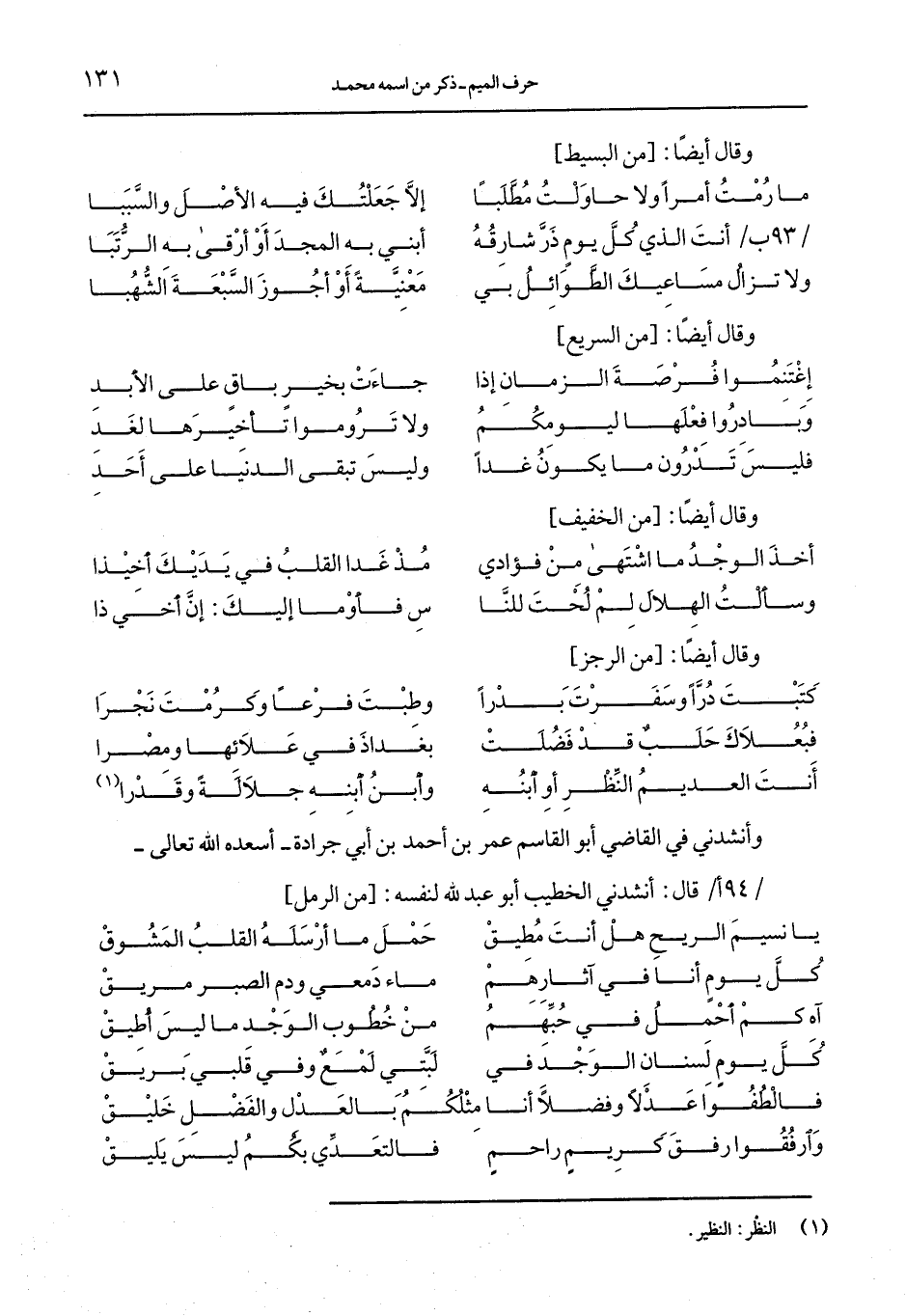 وأنشدني في القاضي أبو القاسم عمر بن أحمد بن أبي جرادة- أسعده الله تعالى-قال: أنشدني الخطيب أبو عبد لله لنفسه: [من الرمل]