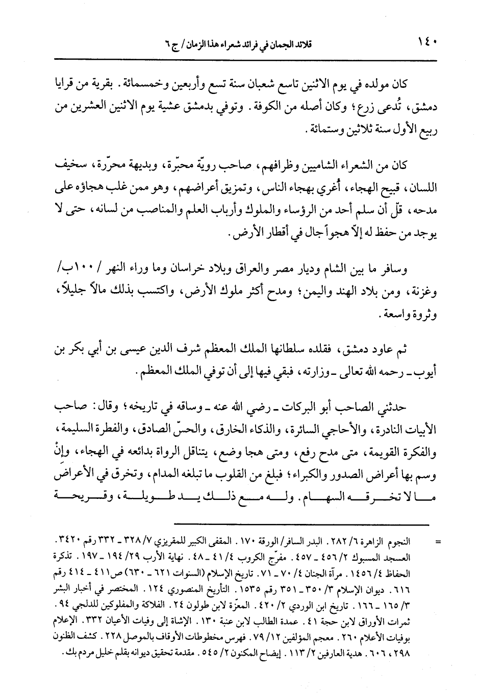 حدثني الصاحب أبو البركات- رضي الله عنه- وساقية في تاريخه, وقال: صاحب الأبيات النادرة, والأحاجي السائر, والذكاء الخارق, والحسّ الصادق, والفطرة السليمة, والفكرة القومية, متى مدح رفع, ومتى هجا وضع, يتناقل الرواة بديعه في الهجاء, وإن وسم بها أعراض الصدور والكبراء, فبلغ من القلوب ما تبلغه المدام, وتخرق في الأغراض ما لاتخرقه السهام. وله مع ذلك يد طويلة, وقريحة