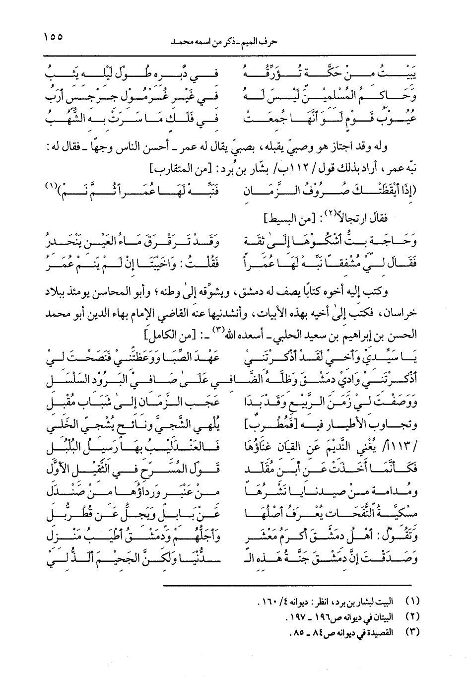 وكتب إليه اخوه كتابًا يصف له دمشق, ويشوقّه إلى وطنه, وأبو المحاسن يومئذ ببلاد خراسان, فكتب إلى أخيه بهذه الأبيات, وأنشدنيها عنه القاضي الإمام بهاء الدين أبو محمد الحسن بن سعيد الحلبي- أسعده الله-: [من الكامل]