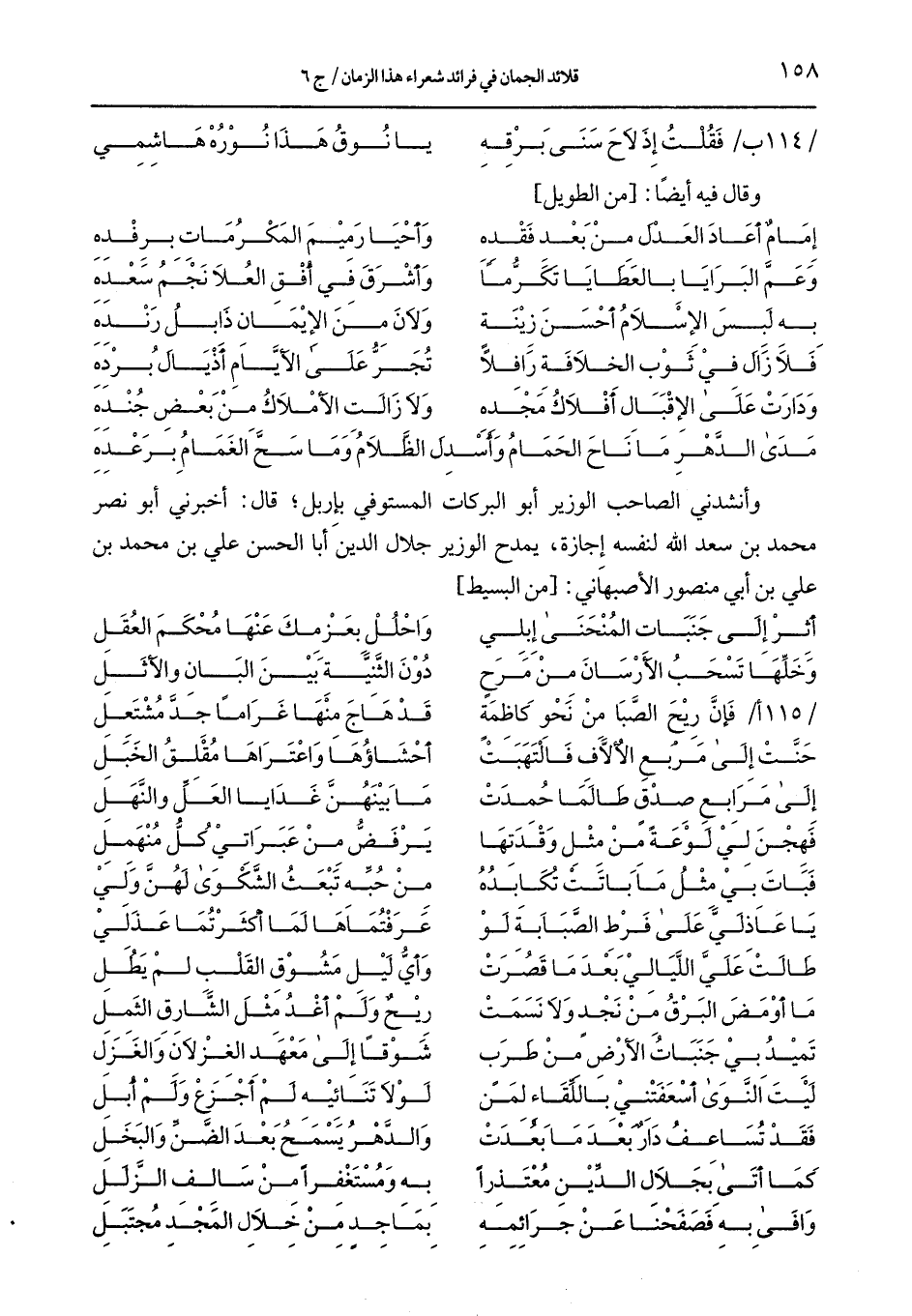 وأنشدني الصاحب الوزير أبو البركات المستوفي بإربل, قال: أخبرني أبو نصر محمد بن سعد الله لنفسه إجازة, يمح الوزير جلال الدين أبا الحسن علي بن محمد بن علي بن أبي منصور الأصبهاني: [من البسيط]