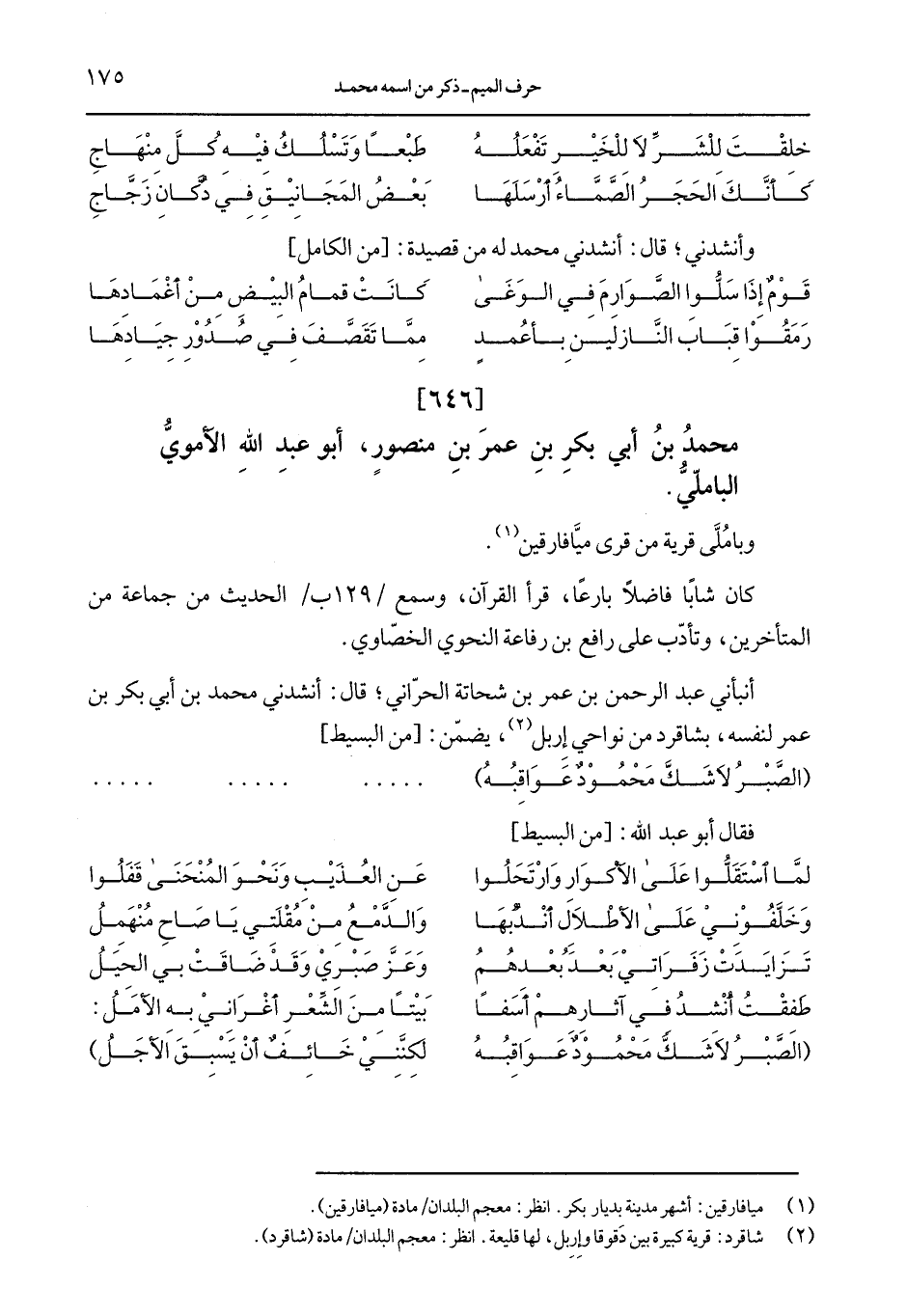 أنبأني عبد الرحمن بن عمر بن شحاتة الحرّاني؛ قال: أنشدتي محمد بن أبي بكر بن عمر لنفسع، بشاقرد من نواحي إربل، يضّمن: [من البسيط]
