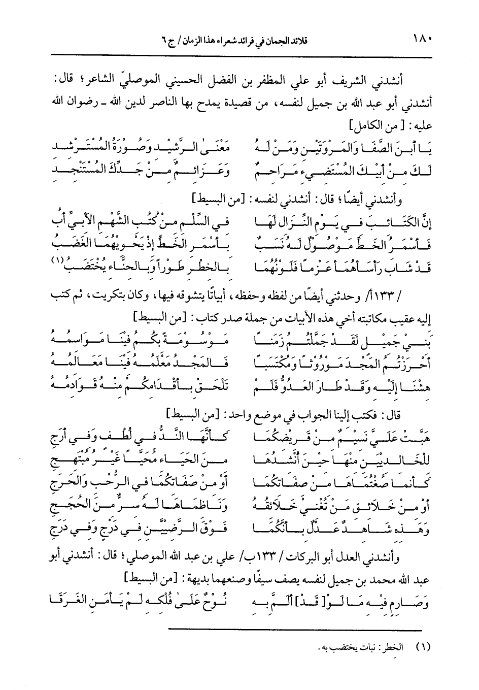 أنشدني الشريف أبو علي المظفر بن الفضل الحسيني الموصلي الشاعر؛ قال: أنشدني أبو عبد الله بن جميل لنفسه، من قصيدة يمدح بها الناصر لدين الله –رضوان الله عليه: [من الكامل]