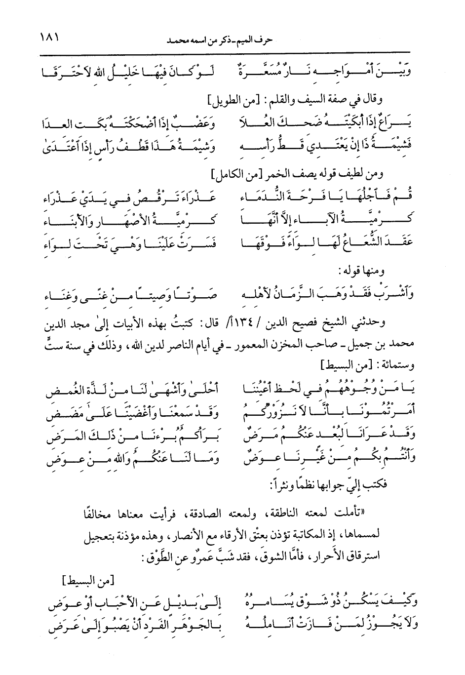 وحدثني الشيخ فصيح الدين قال: كتبت بهذه الأبيات إلى مجد الدين محمد بن جميل –صاحب المخزن المعمور- في أيام الناصر لدين الله، وذلك في سنة ست وستمائة: [من البسيط]