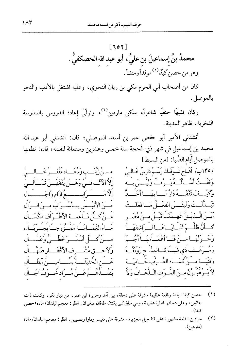 أنشدني الأمير أبو حفص عمر بن أسعد الموصلي؛ قال: أنشدني أبو عبد الله محمد بن إسماعيل في شهر ذي الحجة سنة خمس وعشرين وستمائة لنفسه، قال: نظمها بالموصل أيام الصبا: [من البسيط]
